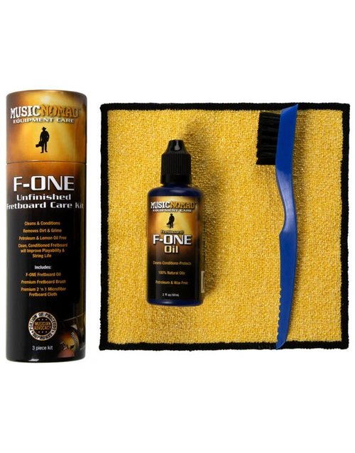 A cleaned & conditioned fretboard will not only improve playability & string life, but prolong the health of the unfinished fretboard wood by keeping it from drying and cracking. Music Nomad's F-ONE Unfinished Fretboard Care Kit contains everything you need to clean & condition your unfinished fretboard. F-ONE Oil is formulated using a complex mixture of the finest ultra refined tree & seed oils to clean, condition & protect your fingerboard. F-ONE does not contain any lemon oil extracts, waxes, petroleum distillates, silicone or water. Our innovative 2 in 1 microfiber fretboard cloth is like no other. One side is soft for gentle applying & cleaning with F-ONE, while the other side is designed with small scrubbers woven into the fabric to penetrate & lift dirt & grime buildup off the fretboard. Our specially designed fretboard brush is the perfect tool for precision cleaning & conditioning around the frets & deeper wood pores. Featuring a V-Cut bristle design & a bonus plastic scraper, you're fully prepared to give your fretboard the total spa treatment it deserves. That's Music Nomad quality - raising the bar in equipment care.