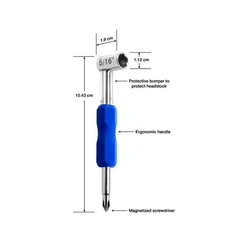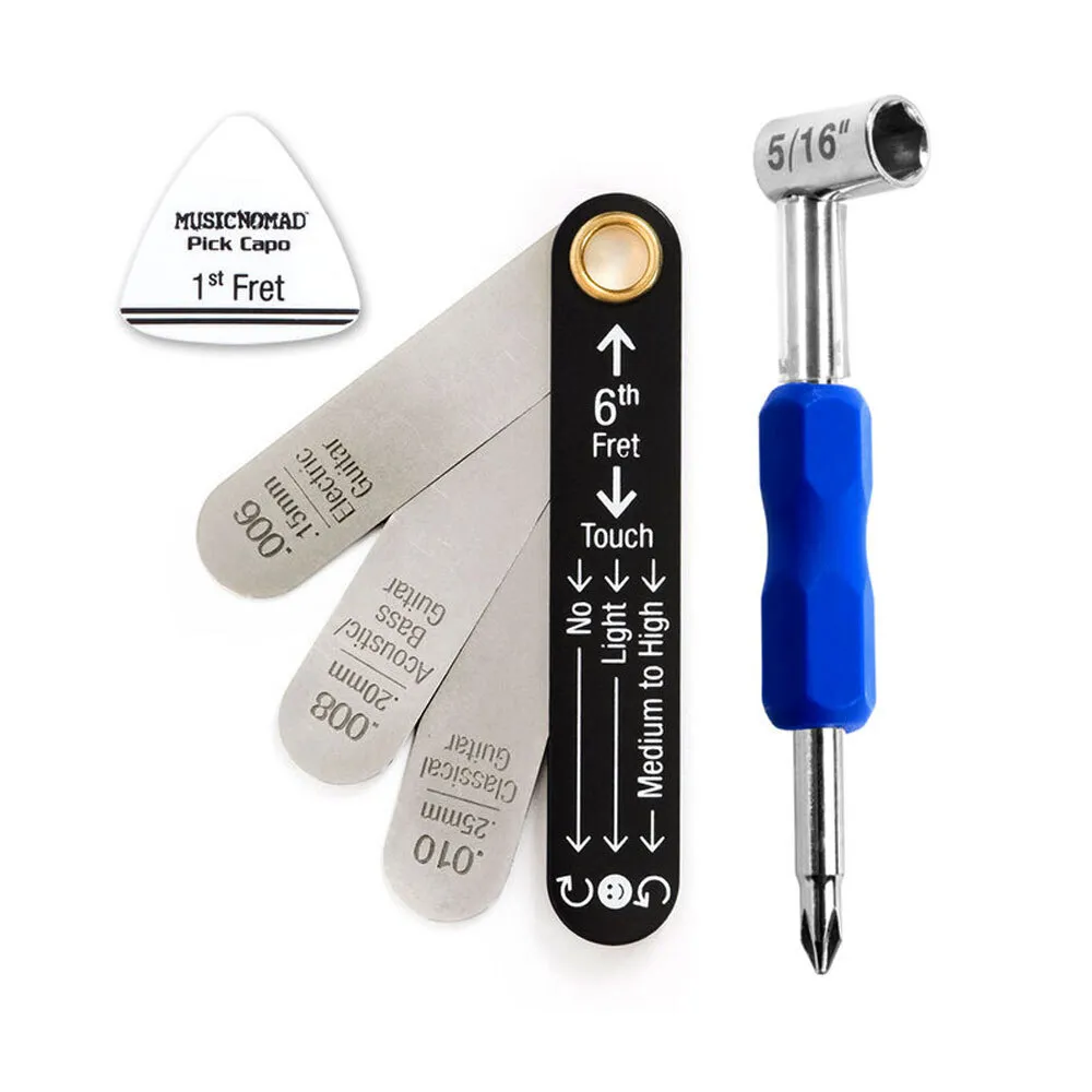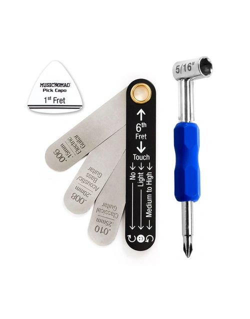 Music Nomad MN611 Truss Rod Neck Relief Measure & Adjust Kit for Gibson and PRS USA guitars makes neck relief adjustments easy and accurate. The Precision Truss Rod Gauge includes the three most common relief measurements (.006", .008", .010") for electric, acoustic, classical, and bass guitars. This kit comes with a Pick Capo and a 5/16" Truss Rod Wrench, designed specifically for Gibson and PRS USA guitars. The ergonomic handle and rubber bumper protect your instrument during adjustments. Improve your playability and sound with this essential kit.