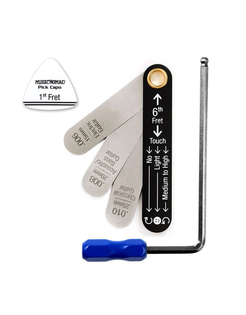 The Music Nomad MN612 Truss Rod Neck Relief Measure & Adjust Kit for Martin guitars simplifies the crucial task of adjusting neck relief. Equipped with a Precision Truss Rod Gauge with three common measurements (.006", .008", .010") and a Pick Capo, it ensures accurate evaluations. The 5mm Premium Truss Rod Wrench is custom-made for Martin guitars, excluding specific models. With an ergonomic handle and rubber protective bumper, this kit enhances comfort and control during adjustments. Elevate your guitar’s playability and sound with this essential tool.