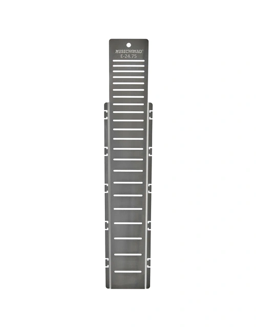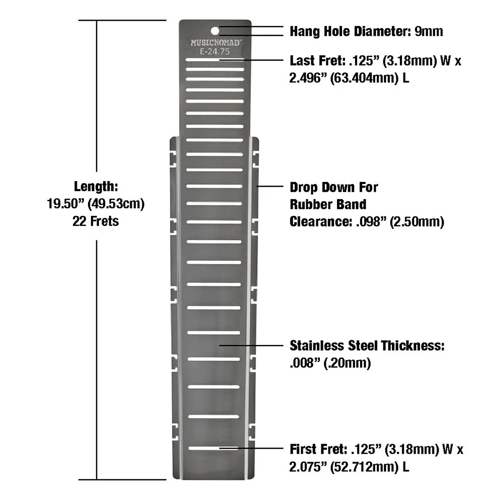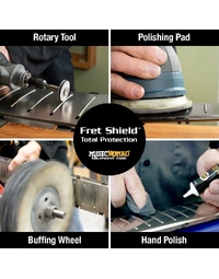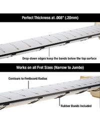 There is nothing like peace of mind while saving time and money. Music Nomad's patent pending Fret Shield sets a new higher standard for total fretboard protection when performing fret work such as polishing, levelling and crowning. Say NO to blue tape with our reusable design that goes on in seconds, fully protects without damaging the fretboard and lasts 100's of fret jobs. Our high quality stainless steel is the perfect thickness at .008" (.20mm), uses a precision manufacturing process free of burrs, and leaves all edges smooth and rounded. Our innovative formed drop-down edges allow the rubber bands we include to hold the Fret Shield in place securely and keep the bands below the top surface to avoid damaging them during the polishing process. Fret Shields come in the most popular Fret Scale sizes and even include a convenient hang hole. Whether your fretboard is finished maple or unfinished rosewood with inlays, your board will thank you for protecting it. That's Music Nomad quality, raising the bar in equipment care.