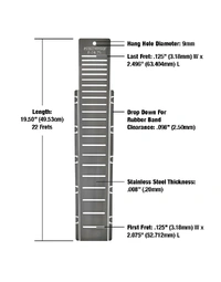 Our patent pending Fret Shield gives you total fretboard protection when performing fret work such as polishing, levelling and crowning on a 24.75" Guitar Fret Scale up to 22 frets. Note: This does not fit GIBSON Electric Guitars. The tapered design has slot sizes that measure from the first fret .125" (3.18mm) W x 2.075" (52.712mm) L to the last fret .125" (3.18mm) W x 2.496" (63.404mm) L and fits all fret sizes (from narrow to jumbo) found on 6 string guitars. Our innovative formed drop-down edges allow the rubber bands we include to hold the Fret Shield in place securely and keep the bands below the top surface to avoid damaging them during the polishing process. The bands also help perfectly form the shield to every fretboard radius. Rigorously tested and designed to be used with power buffing wheels, power polishing pads and other polishing systems. Laser etched logo and size will withstand sanding and filing during fretwork. Extremely useful for protecting all unfinished (rosewood, ebony) and finished (poly and lacquer) fretboards. Convenient hang hole.