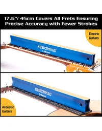 The Music Nomad MN811 Fret Leveller L-Beam (17.6") is engineered to set new standards in fret and fingerboard care. Ideal for acoustic and electric guitars, this 17.6" leveller provides comprehensive fret coverage and precise accuracy with fewer strokes. Its thicker wall design (1.435 lbs / 651g) leverages the tool’s weight to do the work. The ergonomic curved handle ensures optimal comfort and control, while the radius-bevelled edges prevent damage to high frets. Precision-ground flat edges, with a tolerance of +/-.00125" per foot, guarantee flawless results. Included are three 3M Stikit Gold Abrasive strips (2 P240, 1 P400). Made from durable 6063-T5 Aluminium with a blue anodised finish.