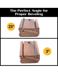 With the ideal 23-degree and 3" file angles, no detail was overlooked in designing this revolutionary bevel file. The high-quality, durable Acacia wood ergonomic handle is shaped with a curved radius underside and is wide enough to lay centered across the entire fretboard, providing for unmatched stability when filing.
