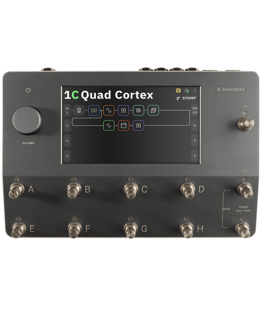 Loaded with over 90 amplifiers, 100 effects, and 1,000 impulse responses (IRs), the Quad Cortex offers a vast selection of tones and sonic possibilities. Its 7-inch multi-touch display ensures ease of use, allowing users to effortlessly create complex signal paths. Additionally, stainless steel 2-in-1 rotary footswitches provide intuitive control, mimicking the feel of traditional knobs and footswitches.