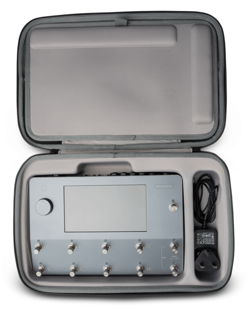 The package includes the Neural DSP Gigbag, a semi-rigid clamshell case designed to protect the Quad Cortex during transport. With custom-moulded compartments and a hard humidity-resistant exterior, it ensures a secure fit and robust protection against the elements.