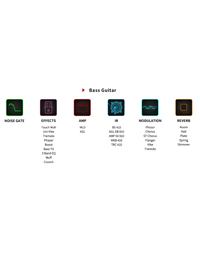 | Effects: Touch Wah, U-Vibe, Tremolo, PH 100 Chorus, ST Singer Chorus, CE-1 Chorus, SCF Chorus, Analogue Delay, Digital Delay, Mod Delay, Ping Pong Delay, Room Reverb, Hall Reverb, Plate Reverb, Spring Reverb, T Screamer, Katana, 3 Band EQ, Muff Fuzz, Crunch Box, Red Dirt, Morning Drive, Dist One, Rose Comp, Noise Gate |