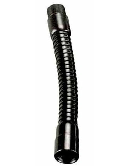 6" Gooseneck, black. Solid steel male and female threaded ends. The flexible neck is made from interlocking rolled metal.