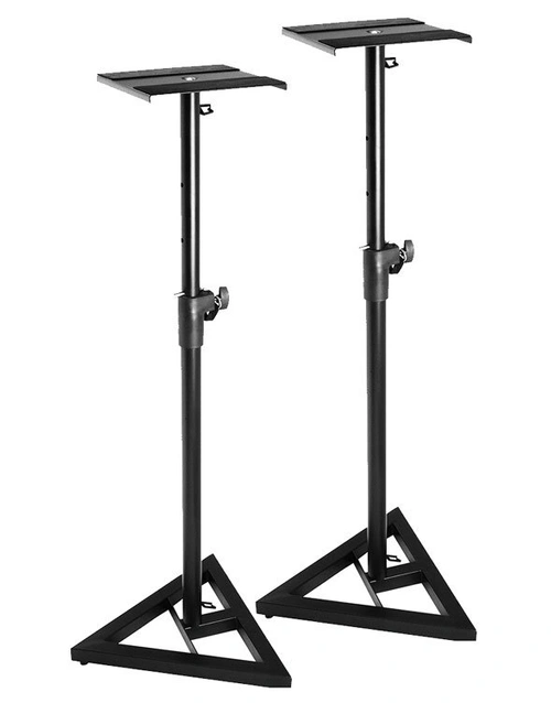 Professional Studio Monitor Stands adjust from 36.5 - 54" in height to customize your listening area. The stands feature a heavy duty stamped Hex-Base, which provides a stable foundation and can hold up to 90 lbs per stand. Rubber feet and EVA rubber on the platform add stability and shock absorption. Six leveling carpet spikes can be installed for extra stability when using the stand on carpet.