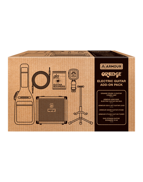 The Armour-Orange Add On Electric Guitar Pack Contains 1x Orange Crush 12 Guitar Combo Amp, 1x Armour ARM1550G Electric Guitar Gig Bag, 1x Armour GS10 10ft Guitar Lead, 1x Armour GS50B Guitar Stand Black, 1x Armour CTU300 Clip-On Tuner, 1x Set of GHS GBL (10-46) Boomer Strings.