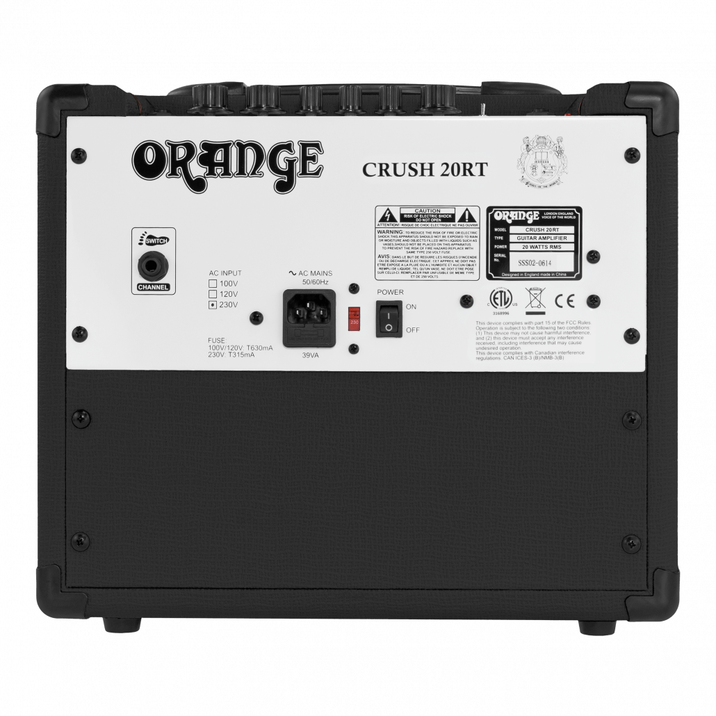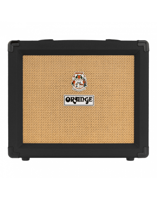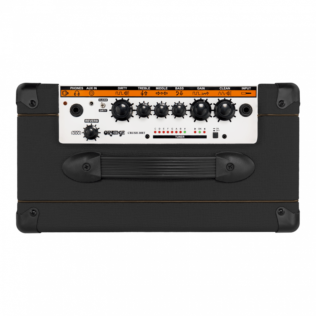 The Orange Crush 20RT BK is an all-analogue 20-watt amp, with one of Orange's custom 8" Voice of the World speaker. This amp features onboard reverb, plus footswitchable Clean and Dirty channels (footswitch not included), with a four stage, high gain, preamp design, meaning you get a huge variety of overdrive and distortion. An integrated tuner, Aux-in, and CabSim-loaded headphone out, makes the Crush 20RT the perfect portable practice amp, that delivers that classic Orange tone.