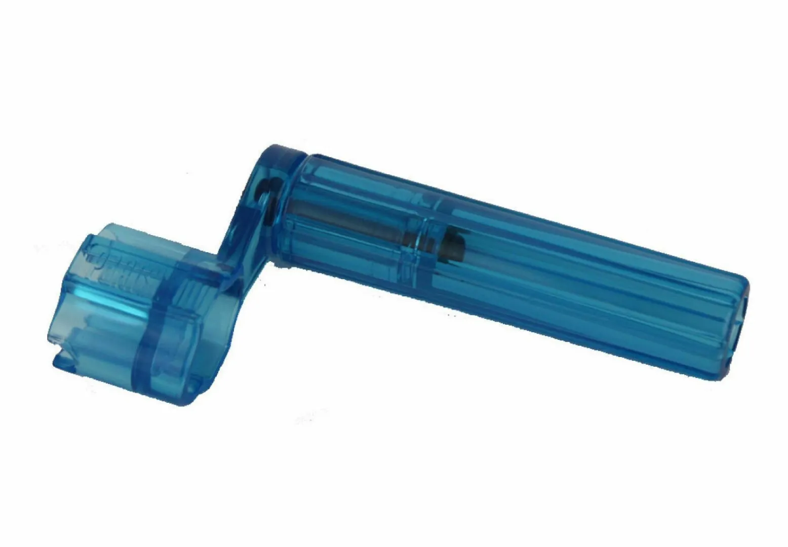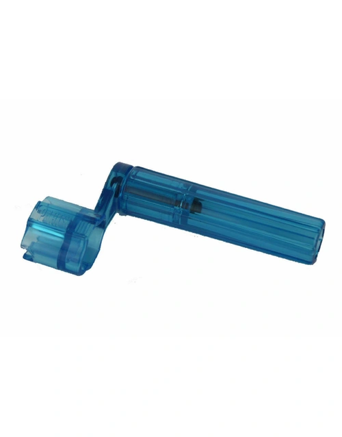 Head suits different size buttons. Chunky construction with thick handle and bridge pin remover. Transparent blue colour