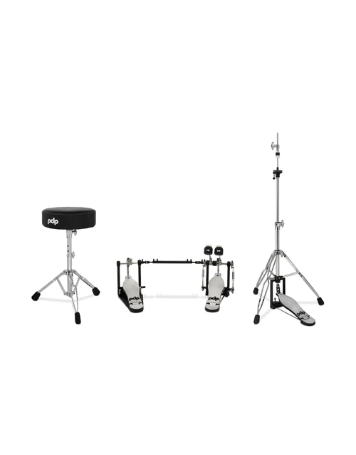 The PDP PDHWPK3DP 3-Piece 700 Series Hardware Pack includes a Double Pedal, Hi-Hat Stand & Stool