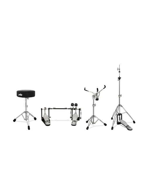 The PDP PDHWPK4DP 4-Piece 700 Series Hardware Pack includes a Double Pedal, Hi-Hat Stand, Snare Stand & Stool