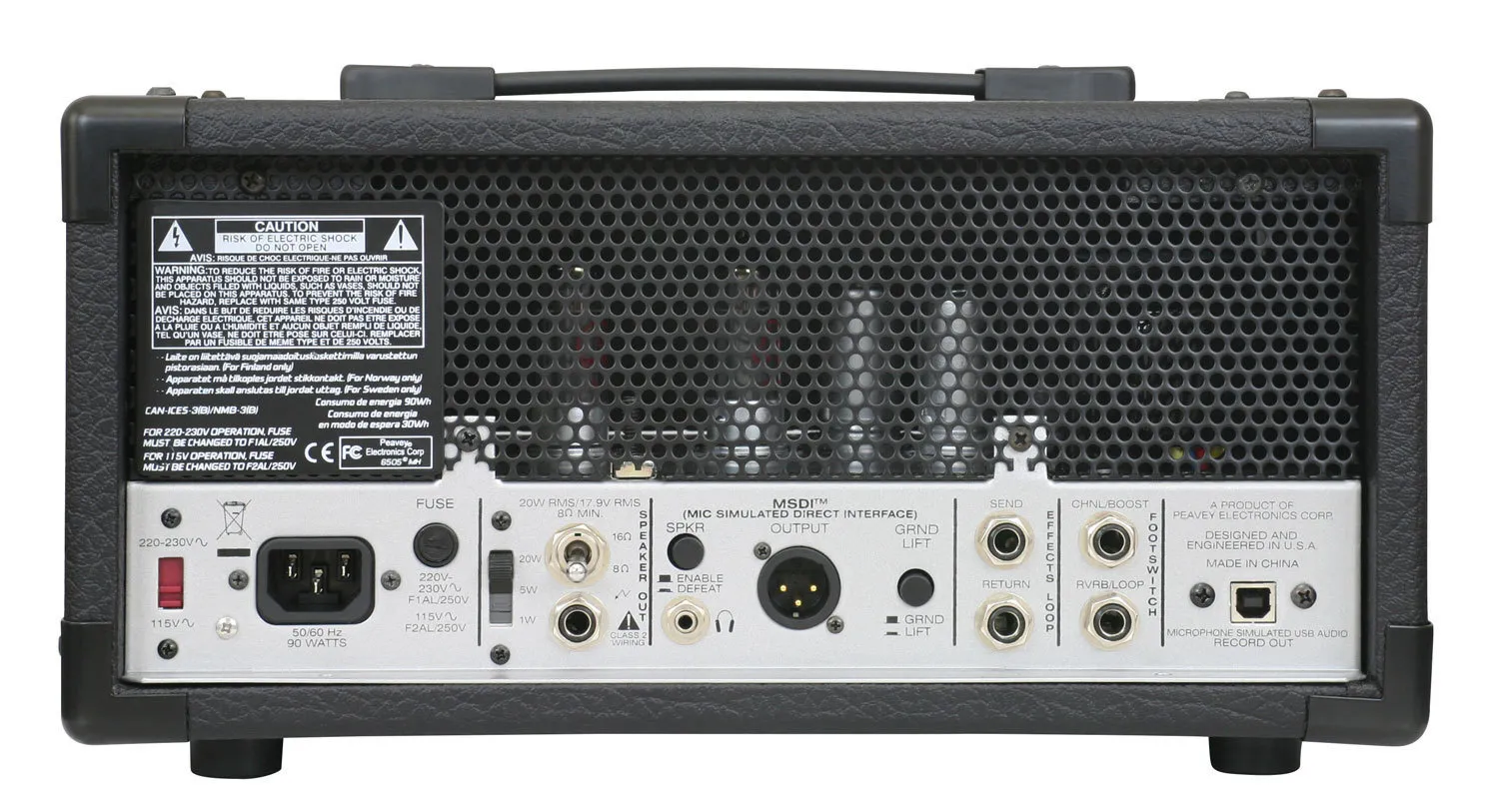 This all tube 20W head may be small in size, but it packs a punch just like its older brother at a fraction of the weight and price. The 6505 MH has two channels: Rhythm and Lead. These two channels have a shared EQ (Low, Mid and High) and there is also Presence and Resonance (more low end/depth) control to really dial in a crushing tone. Independent gain and volume controls for each channel. On the back you can see controls for the switchable wattage (20, 5 and 1) so you can use this head for any application/situation/room. The 6505 MH also features a MSDI (Mic Simulated Direct Interface) XLR output for direct recording or plugging straight into the PA. The amp also has an effects loop and footswitch input options for Channel, Boost, Reverb and Effects Loop switching. Lastly, there is a Microphone Simulated USB Audio output for recording straight into the computer. Tiny amp, light as a feather, huge sound!