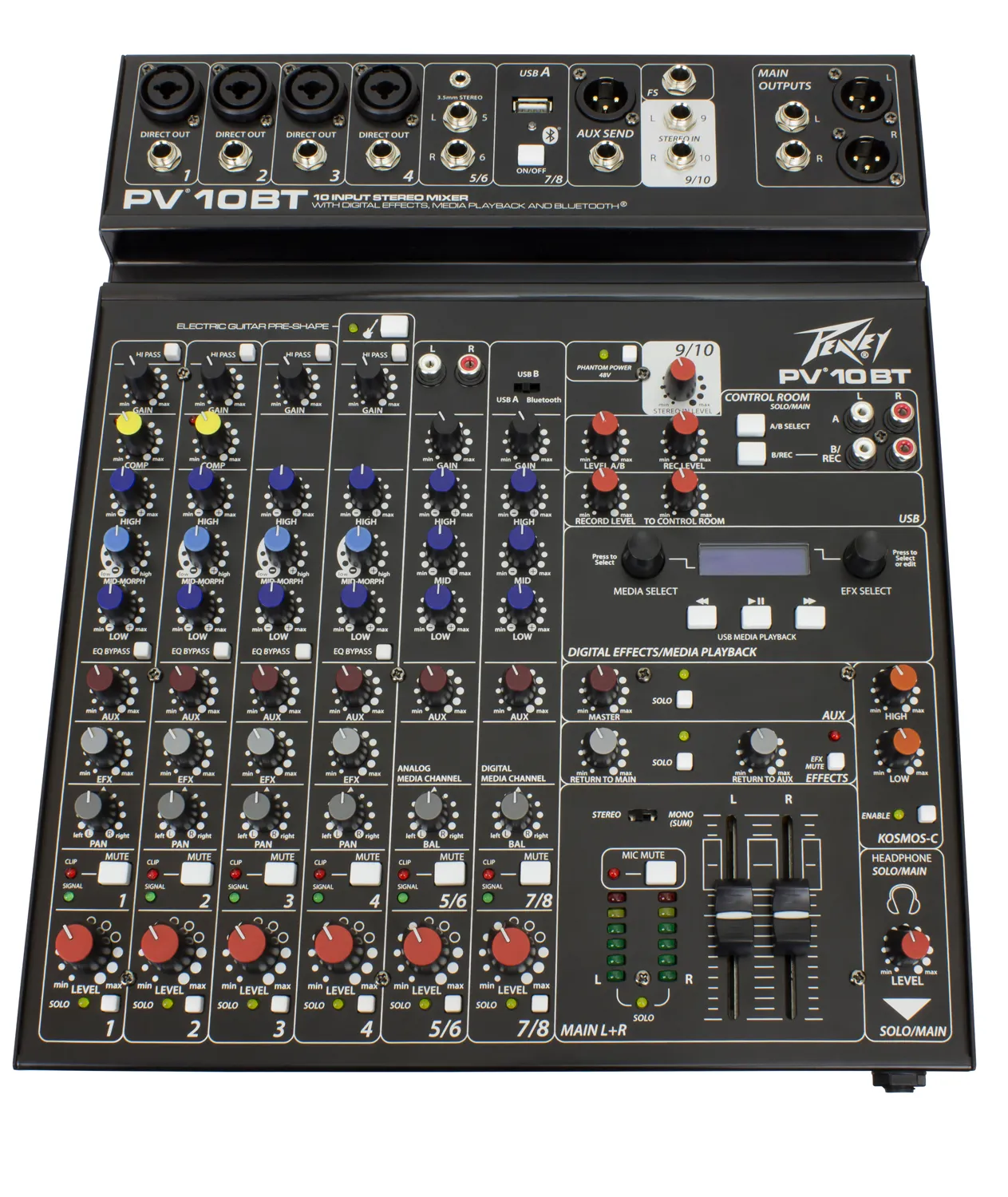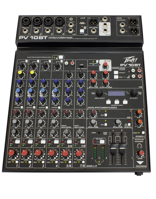 The PV 10 BT includes 4 channels of reference quality mic preamps, 4 direct outputs for recording, a stereo channel, media channel with Bluetooth wireless input, high quality digital effects with LCD display, streaming USB out, MP3 playback via USB A input, Peavey's exclusive Kosmos audio enhancement, 48-volt phantom power, dual selectable control room outputs, 2 channels of compression, one channel of on board selectable guitar preamp, 3-band EQ per channel with bypass, channel mute buttons, aux send, signal clip indicators, and a stereo master LED meter bridge. This amazingly versatile mixer is at home both in the studio as well as live applications.