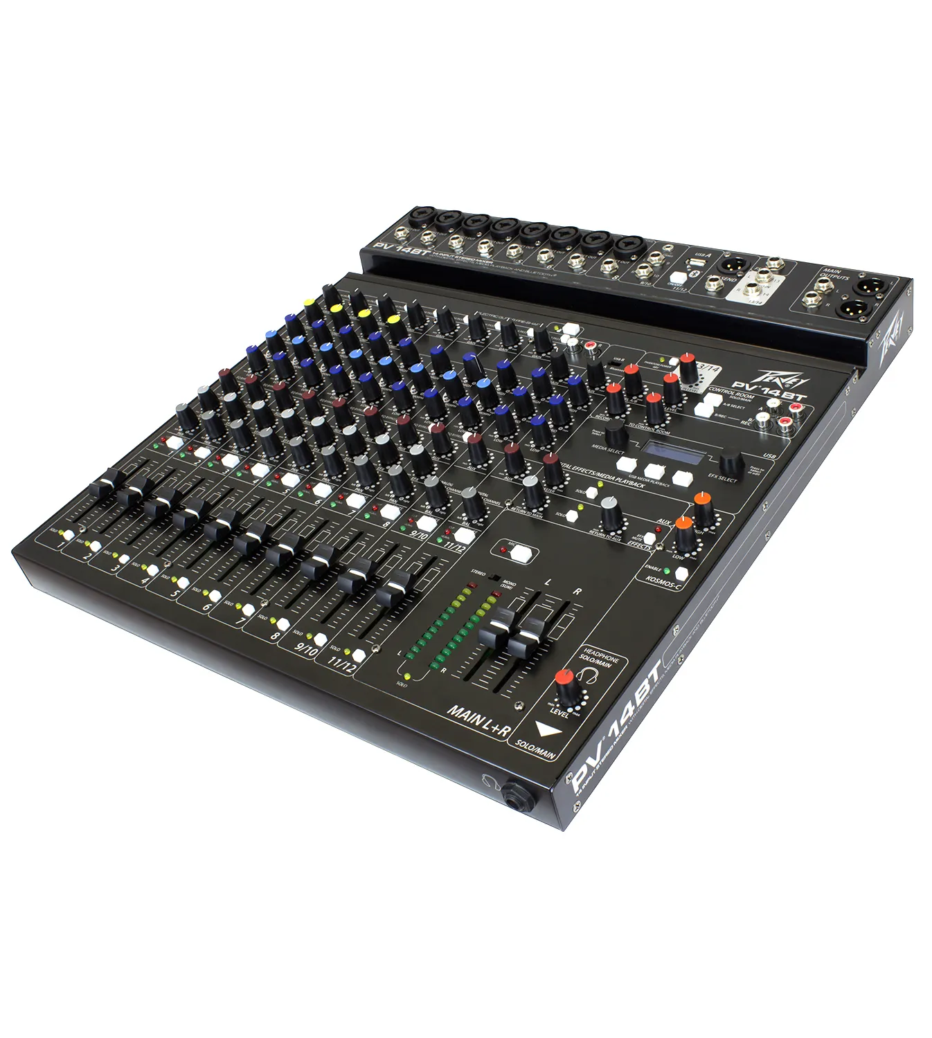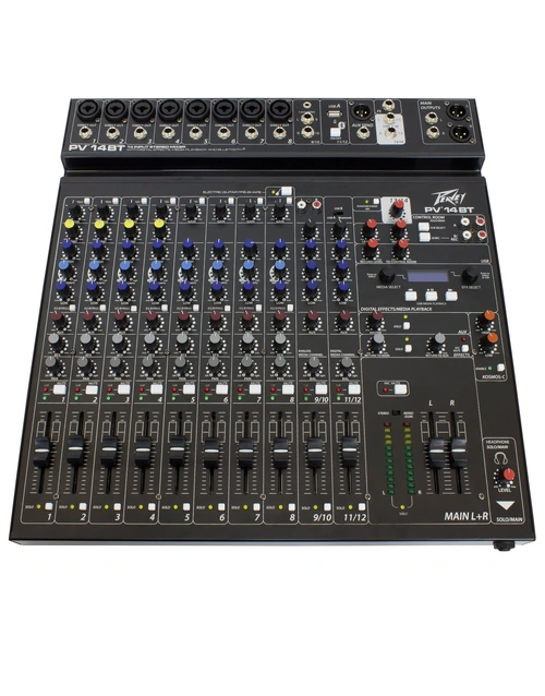 The PV 14 BT includes 8 channels of reference quality mic preamps, 8 direct outputs for recording, a stereo channel, media channel with Bluetooth wireless input, high quality digital effects with LCD display, streaming USB out, MP3 playback via USB A input, Peavey's exclusive Kosmos audio enhancement, 48-volt phantom power, dual selectable control room outputs, 4 channels of compression, one channel of on board selectable guitar preamp, 3-band EQ per channel with bypass, channel mute buttons, aux send, signal clip indicators, and a stereo master LED meter bridge. This amazingly versatile mixer is at home both in the studio as well as live applications.
