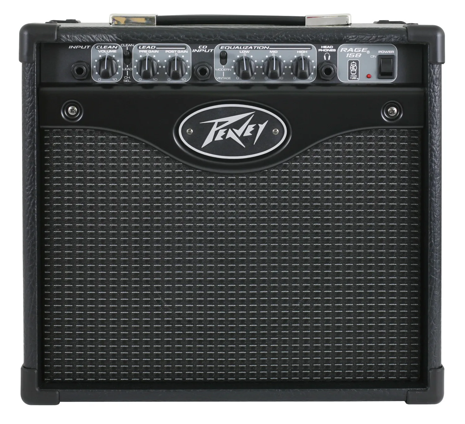 The Rage 158 15W Guitar Amplifier features 2 channels and 2 radically different voicings -- Modern and Vintage. The Modern position maintains a warm, standard voicing while the Vintage position adds a hint of brightness to emulate some classic amp designs. Pre and post gain knobs, 3-band EQ, a headphone jack, and a tape or CD input make this hard-hitting little amp perfect for back porch jamming or solo practice.