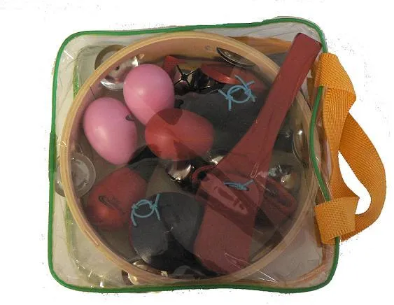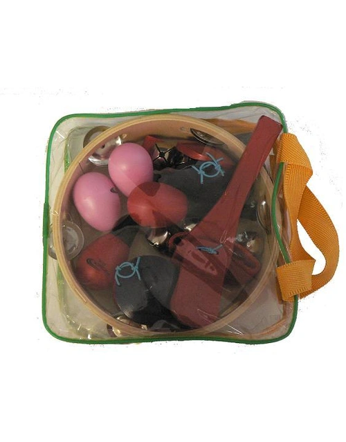 Includes:1x Medium Tambourine with Head (5 Row Jingles) ,2 (prs) Egg Shakers,2 (prs) Castanets, 1(pr) Handheld Wrist Jingle Bells,