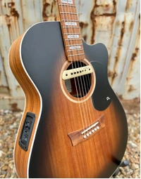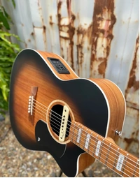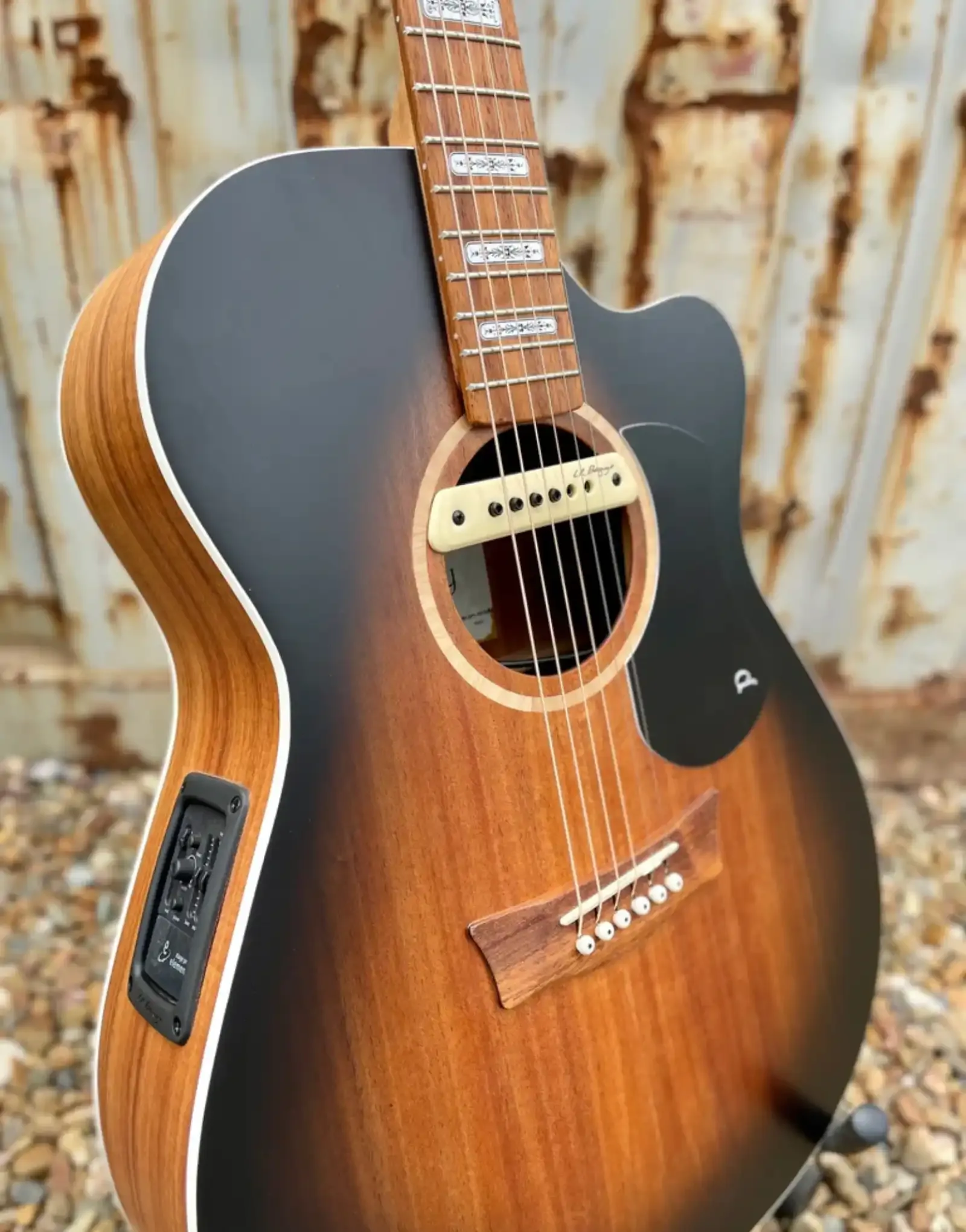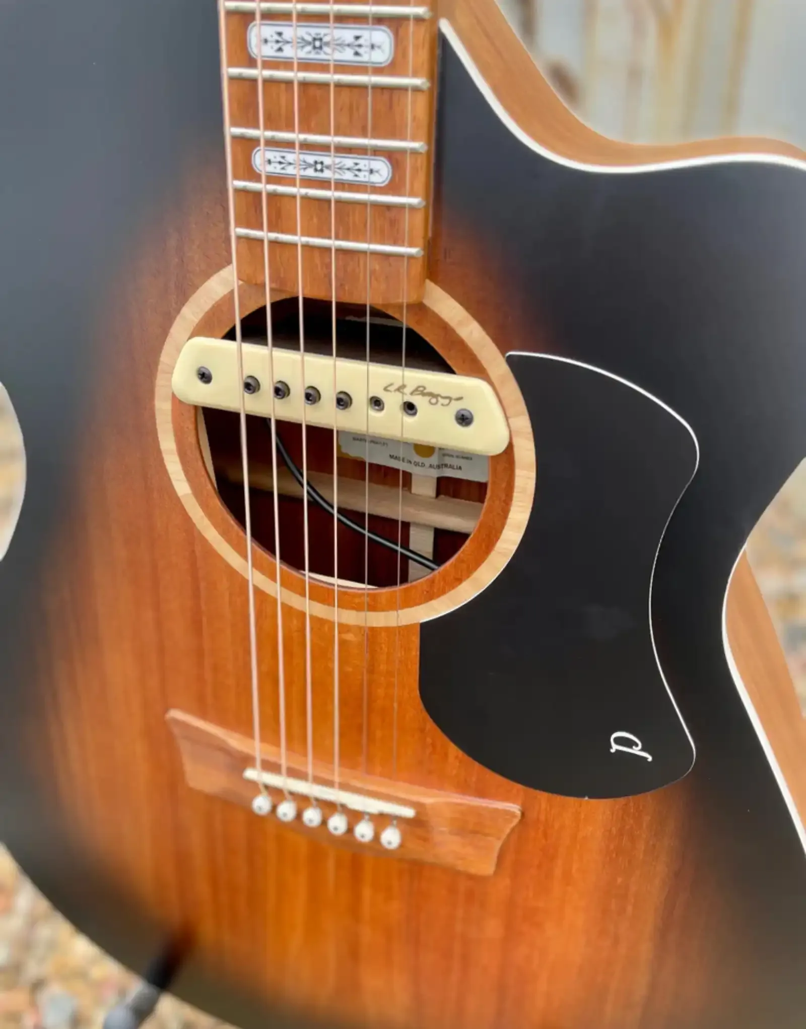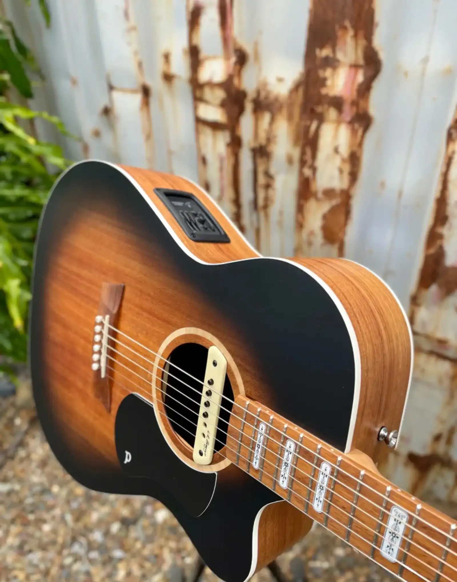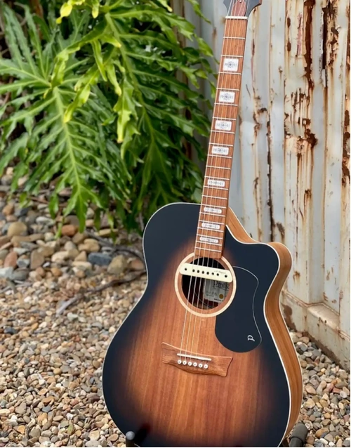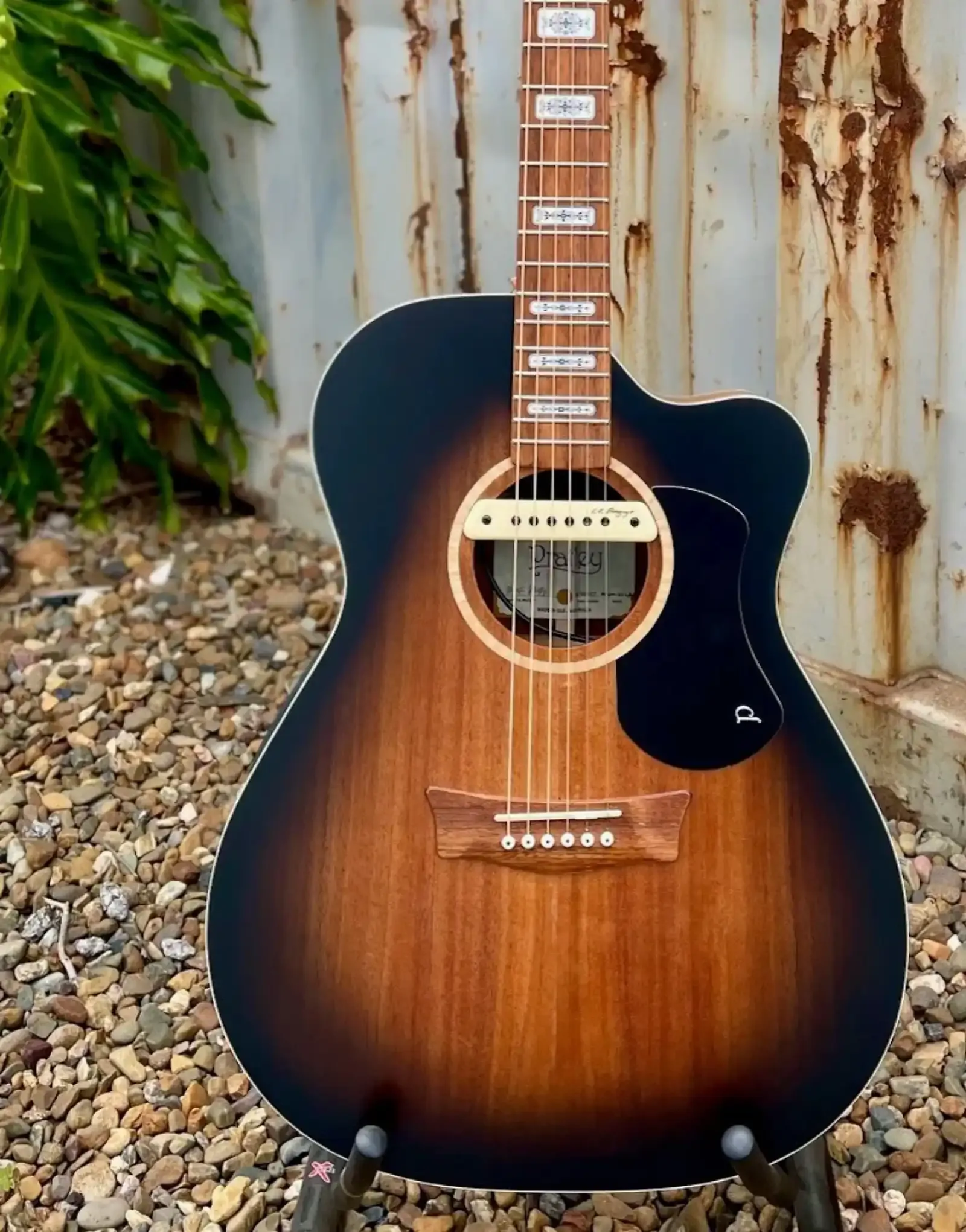 The Pratley PRAGOM-SCE-BWVB Ash Grunwald Signature is a handcrafted masterpiece designed in collaboration with the acclaimed Australian blues musician. This all-solid Blackwood Orchestra Model (OM) cutaway guitar offers exceptional tonal balance and dynamic response, making it ideal for a wide range of playing styles. It features a AAA Grade Johnstone River Teak fretboard and bridge, a premium Queensland Maple neck, and a stunning Vintage Burst satin nitrocellulose finish. The unique rosette, made from solid Tasmanian Mountain Ash, adds a touch of Australian heritage. Equipped with an L.R. Baggs StagePro Element and M1 pickup system with dual output jacks, this guitar is stage-ready with incredible amplified sound.