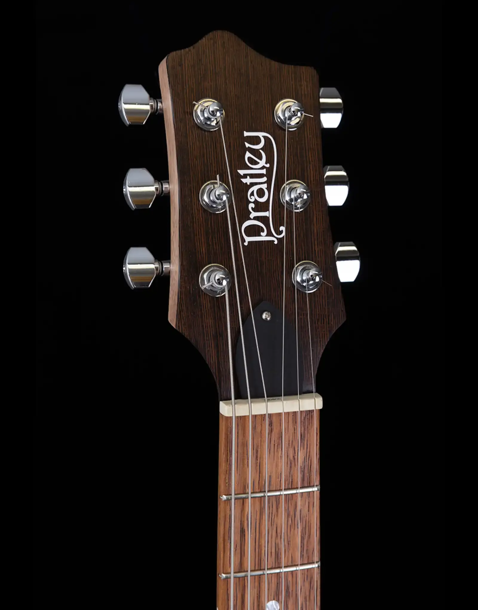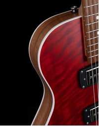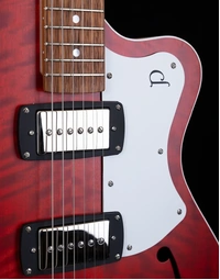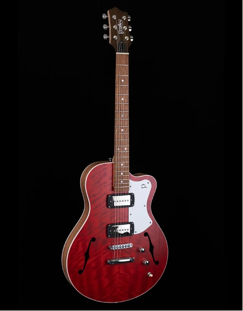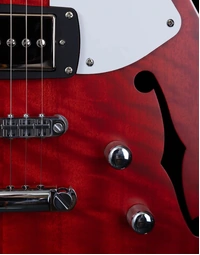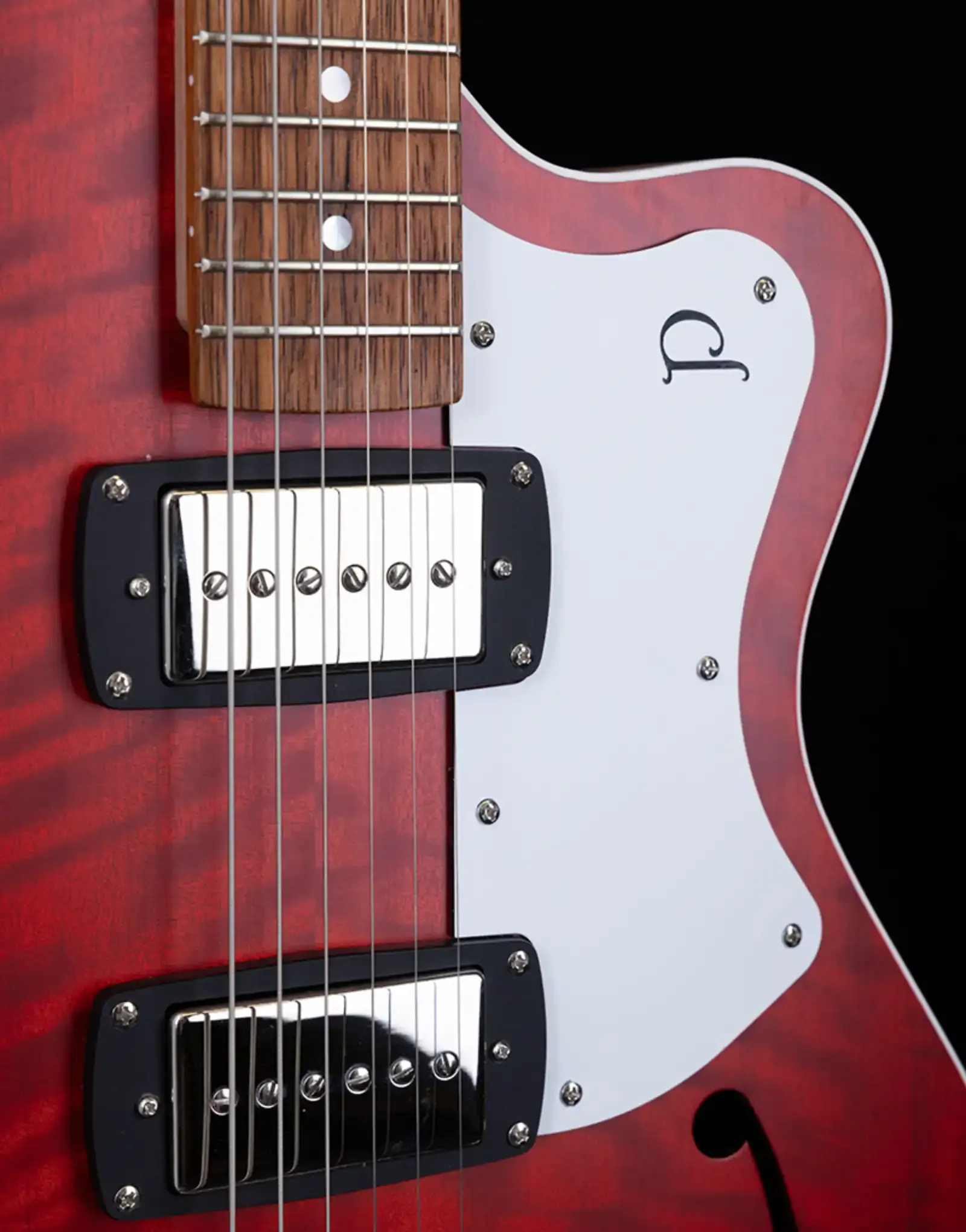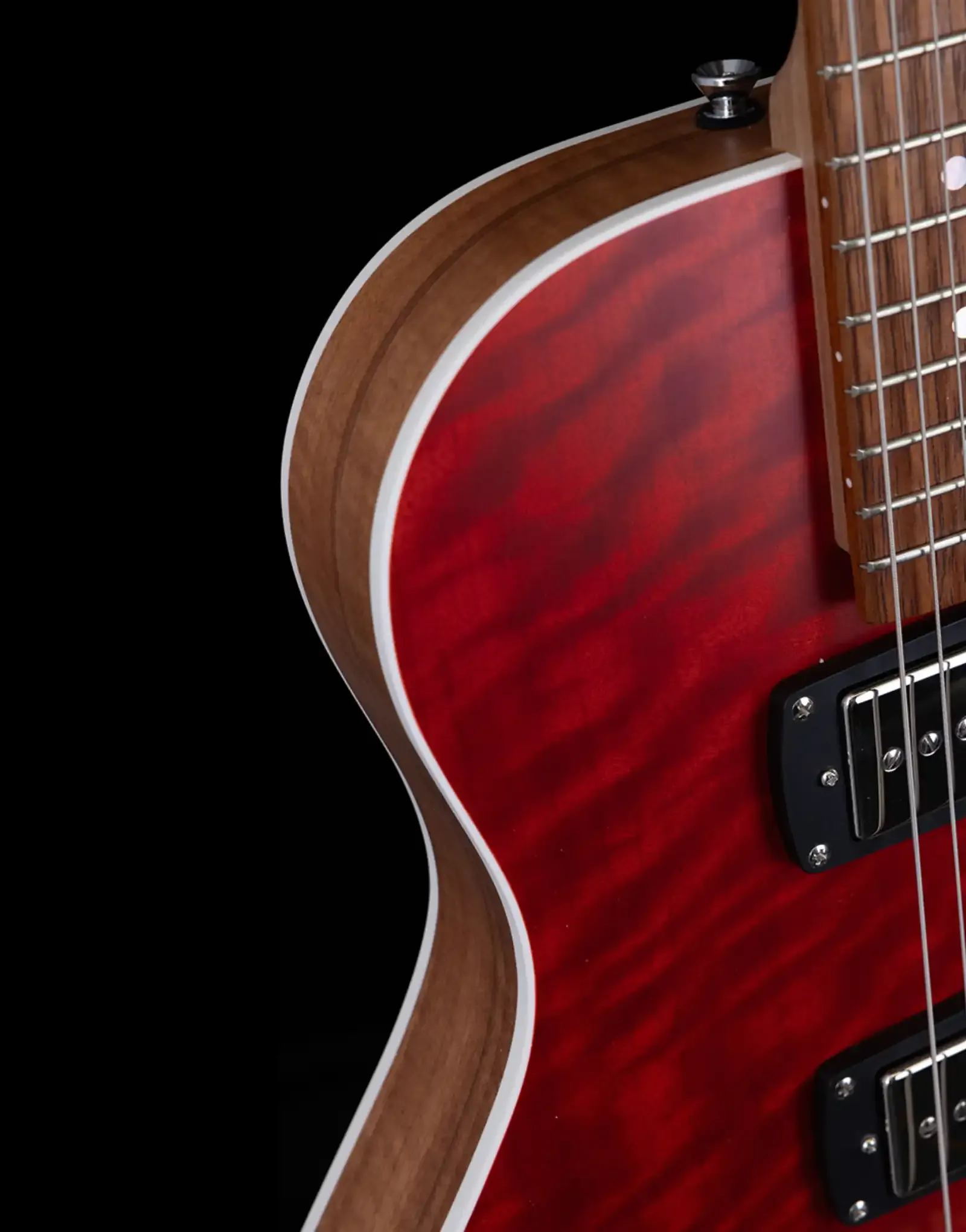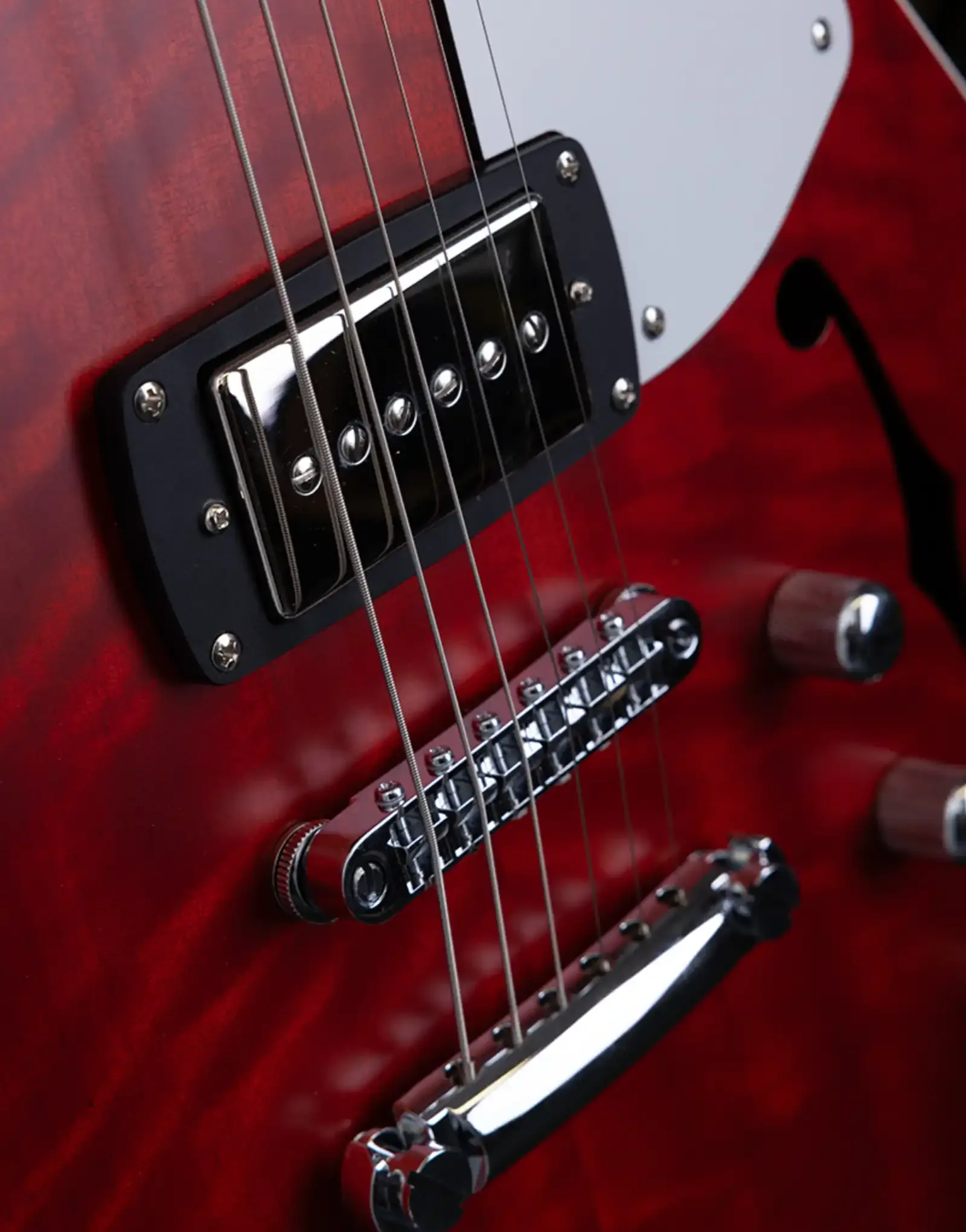 The Pratley PRSH90-R Electric Semi-Hollowbody is a premium handcrafted guitar with a timeless vintage aesthetic and dynamic tonal character. Featuring a Queensland Flame Maple top and Queensland Maple Silkwood back and sides, this single-cutaway semi-hollowbody offers a resonant, warm tone with rich overtones. The Johnstone River Teak fretboard and Queensland Maple neck ensure smooth playability, while the Seymour Duncan Phat Cat P-90 pickups provide punchy, articulate tones with vintage warmth. Equipped with a Gotoh T-O-M bridge and stoptail for superior tuning stability, this guitar is finished in a stunning semi-gloss Nitrocellulose Transparent Cherry Red.