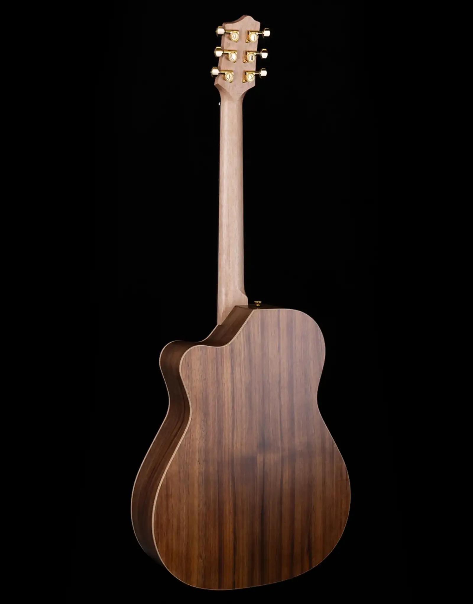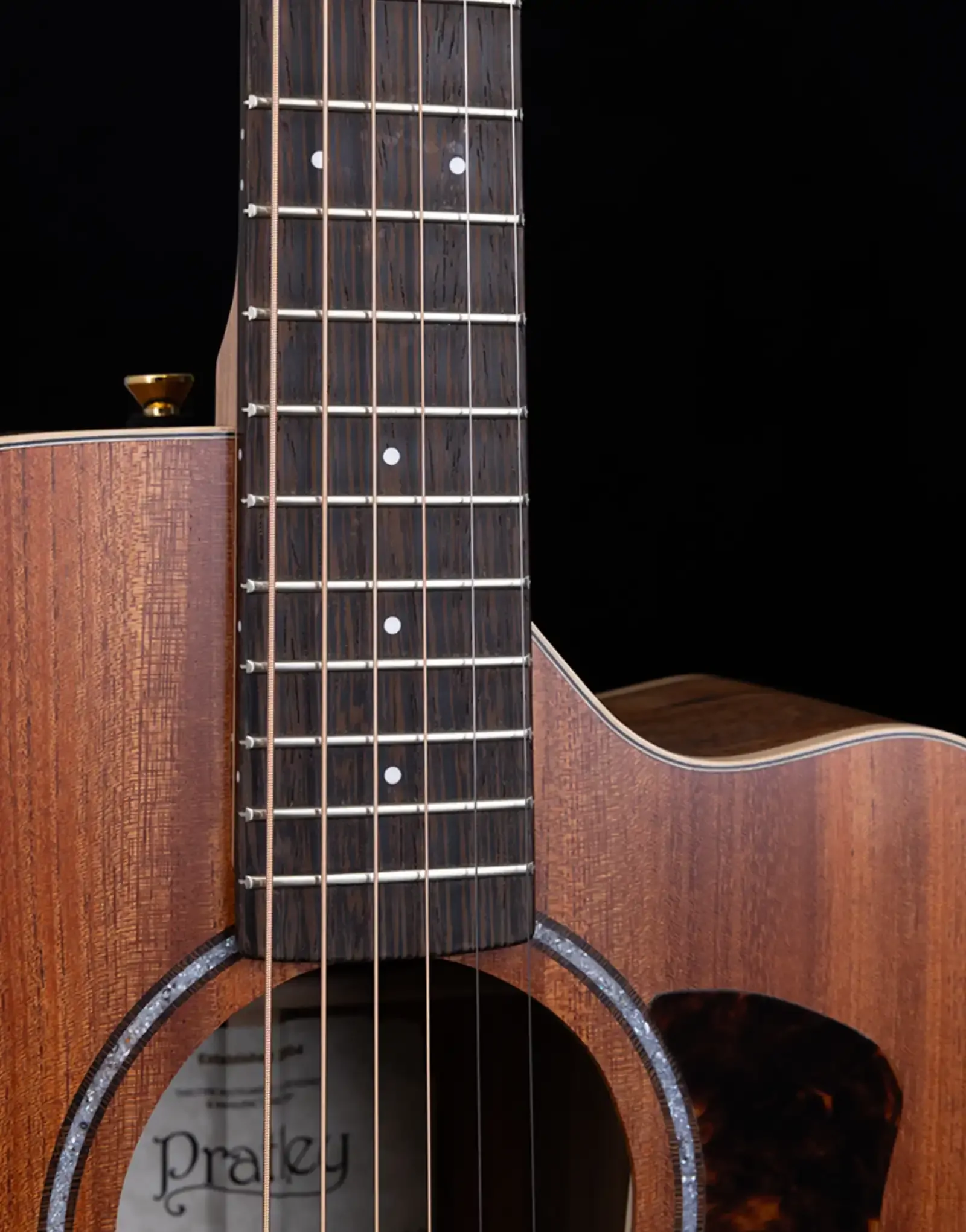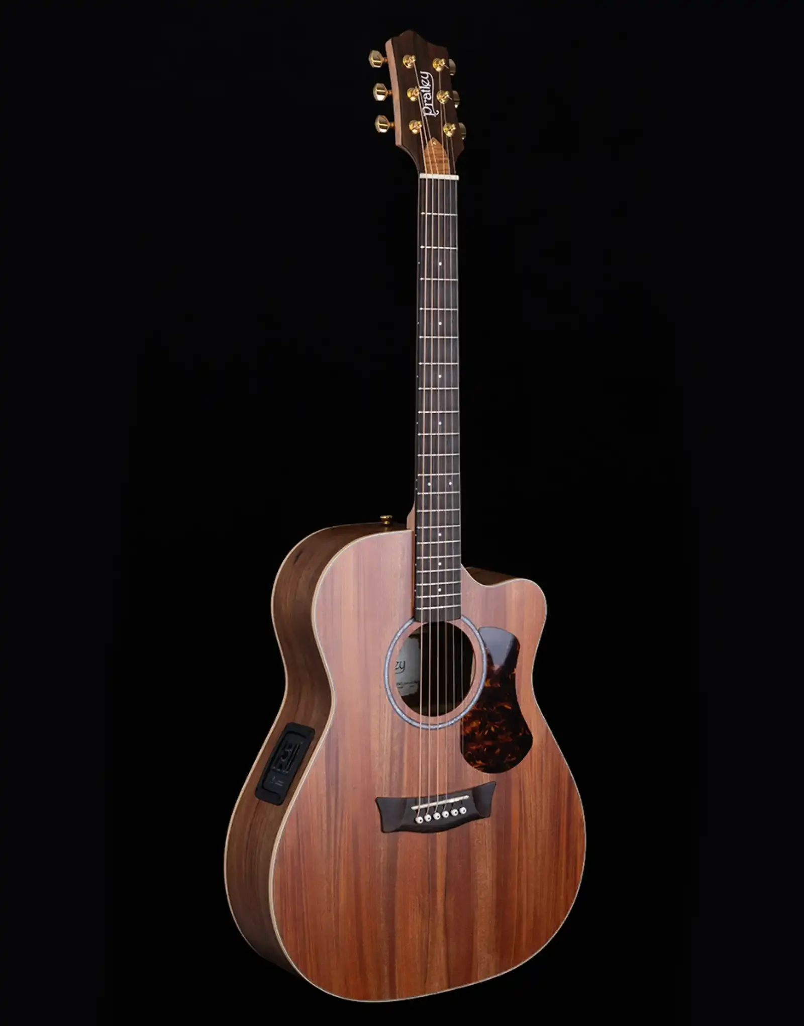 The Pratley PRSTOM-SCE-BWC Studio Series OM Model is a finely crafted acoustic guitar featuring a cutaway design for enhanced upper-fret access. Built with select solid Australian blackwood back and sides and a select solid Australian cedar top, this guitar delivers a warm, dynamic tone with excellent projection. The premium flame Queensland maple silkwood neck and African wenge fretboard ensure smooth playability and lasting durability. Quarter-sawn Queensland Bunya bracing enhances resonance and stability, while the L.R. Baggs StagePro Element pickup provides rich, natural amplified sound. Finished in a fully grain-filled semi-gloss nitrocellulose lacquer, this guitar is a perfect blend of aesthetics and performance.