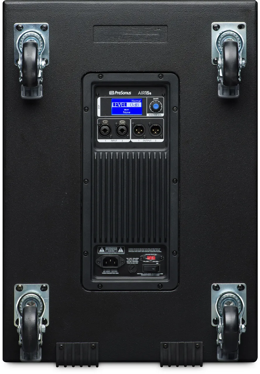 Designed to complement any full-range PA loudspeaker and a perfect companion for the PreSonus® AIR10, AIR12, and AIR15, the AIR15s subwoofer delivers a powerful, clear, and accurate low-end punch. With its 15-inch low-frequency transducer, driven by 1,200 watts (dynamic) of Class D power, it provides plenty of detailed bottom end—all the way down to 35 Hz. Yet it is portable and well suited for mobile applications, as well as installed systems.
