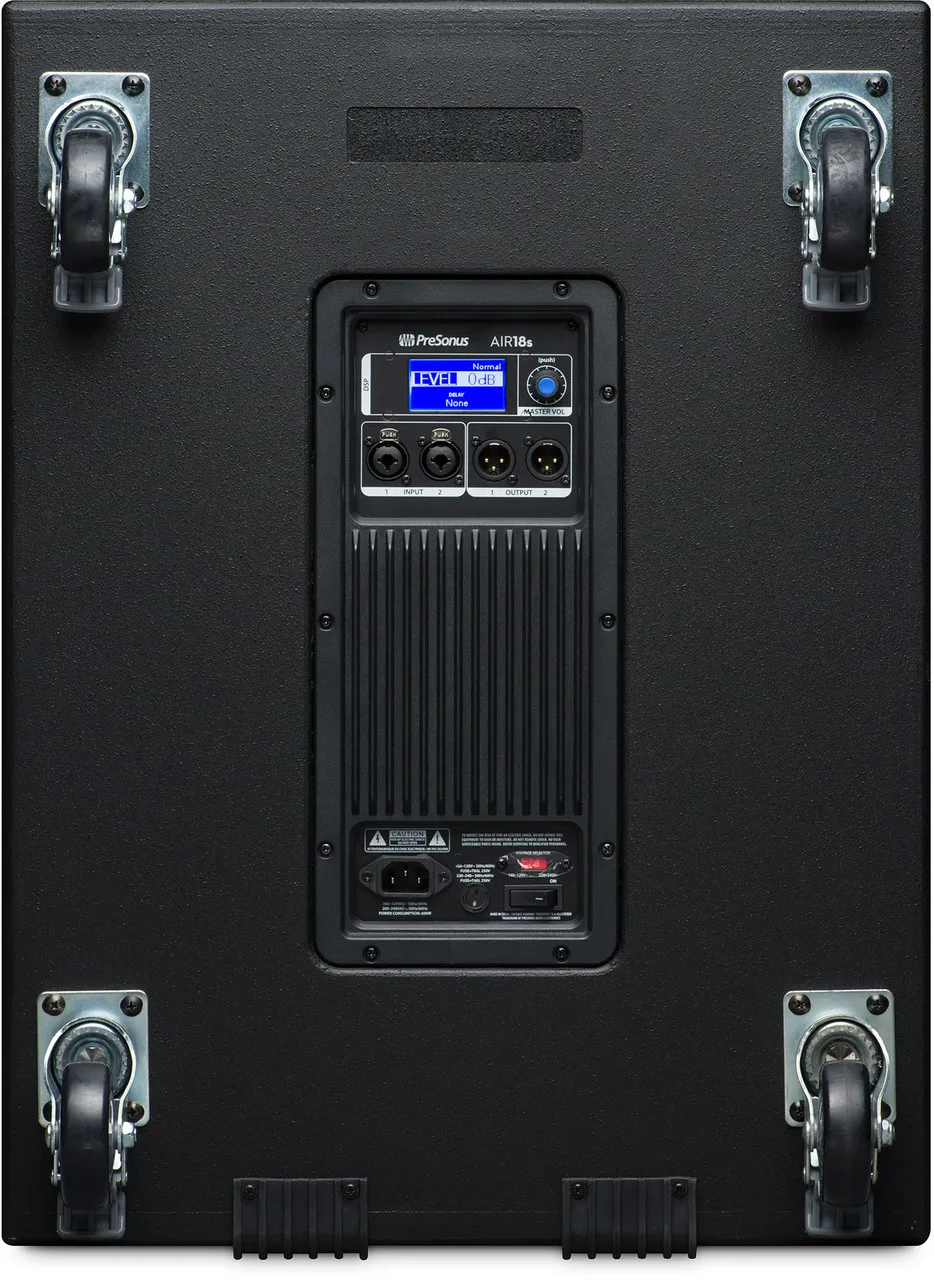 Designed to complement any full-range PA loudspeaker and a perfect companion for the PreSonus® AIR10, AIR12, and AIR15, the AIR18s subwoofer delivers a powerful, clear, and accurate low-end punch. With its 18-inch low-frequency transducer, driven by 1,200 watts of Class D power, it provides plenty of detailed bottom end—all the way down to 35 Hz. Yet it is portable and well suited for mobile applications, as well as installed systems.