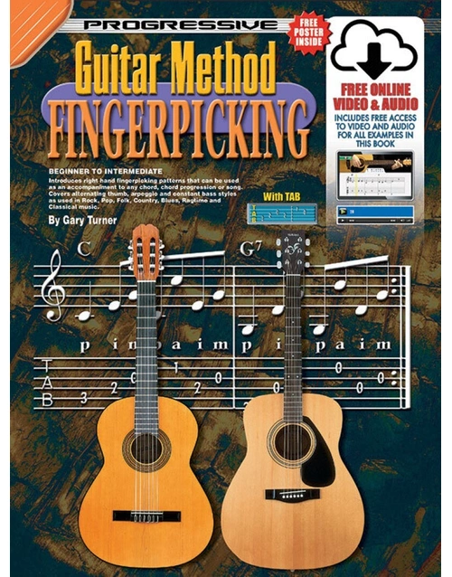 Progressive Guitar Method - Fingerpicking contains all you need to know to start learning to be a great fingerstyle guitar player - in one easy-to-follow, lesson-by-lesson fingerpicking guitar tutorial. Suitable for all ages and all types of acoustic guitars. Basic knowledge of how to read music and playing the guitar is required to teach to learn to play guitar from this book. Comes with instructions to receive free online video & audio demonstrating all examples. See and hear how each one is played by a teacher, then play along with the backing band. Also includes music score animation for easy music learning