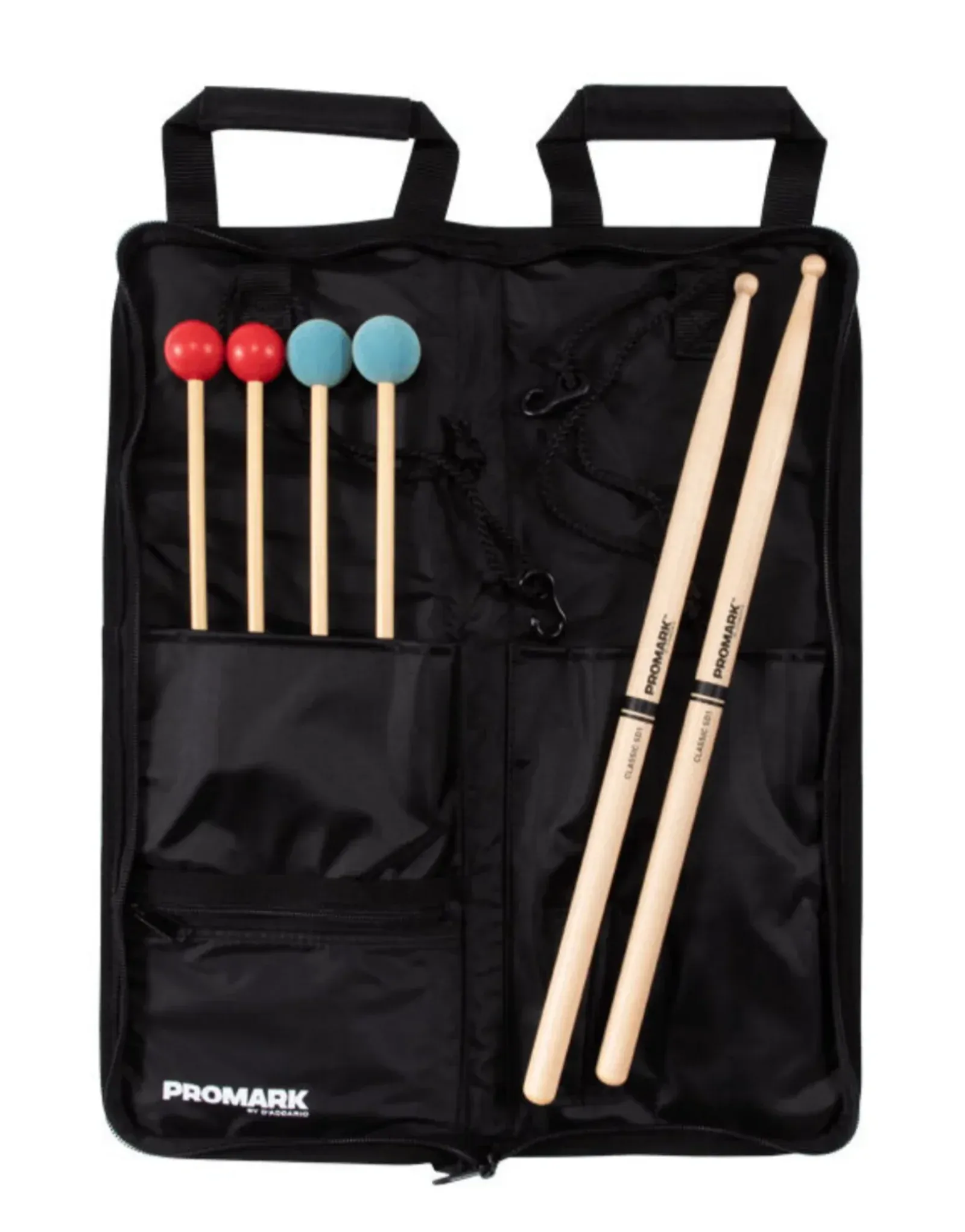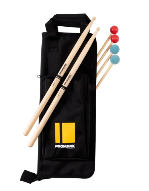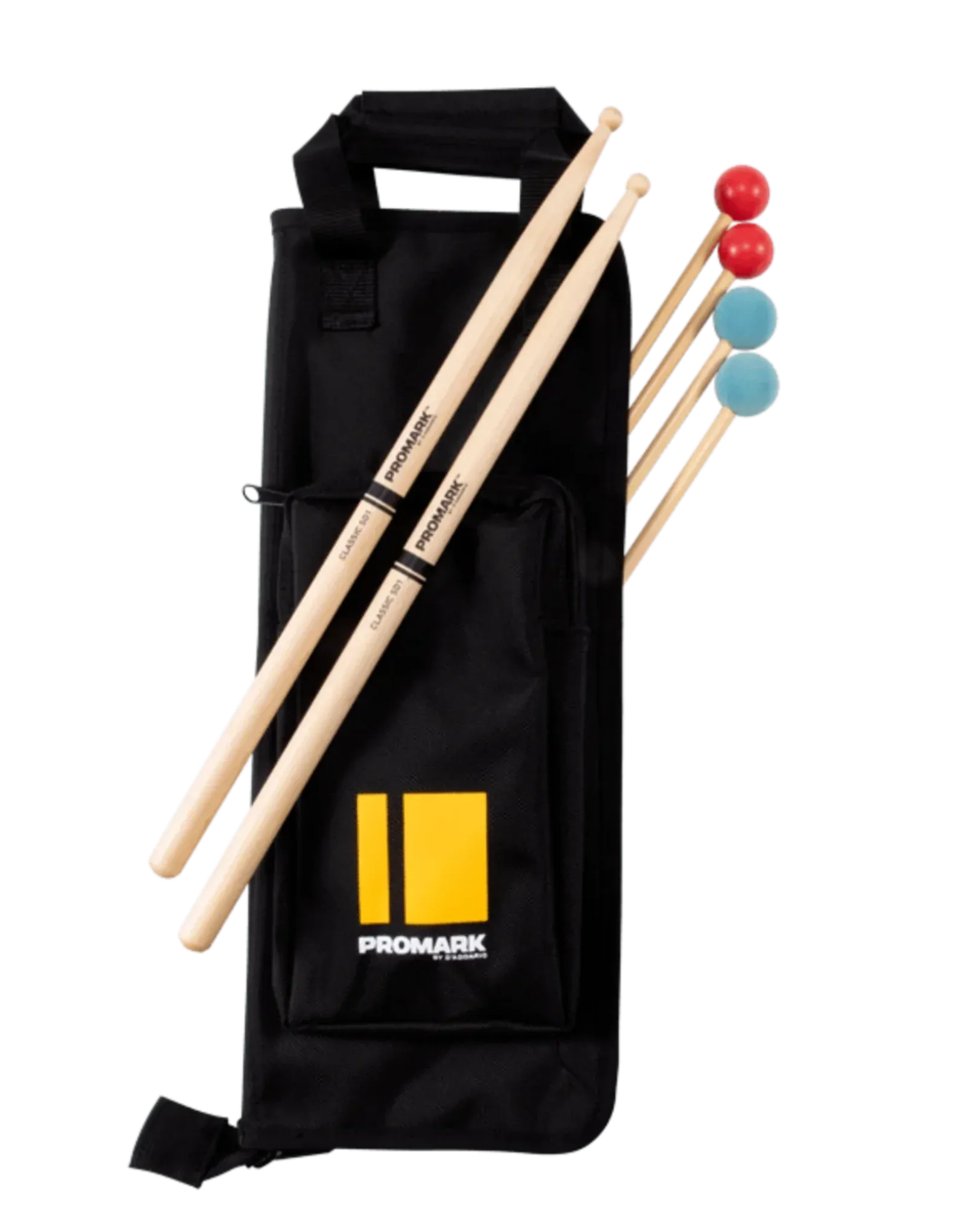 The Promark PMSP1 Apprentice Scholastic Pack is a complete starter kit for beginning percussionists. It includes PSX10 rubber xylophone mallets for soft practice tones, PSX80 poly mallets for clear articulation on xylophone or bells, and a pair of maple SD1 concert snare sticks for comfortable, balanced playing. All sticks and mallets are pre-packed in the durable Promark Everyday Stick Bag, making transport to lessons, rehearsals, and performances easy. Designed, engineered, and manufactured in the USA, this pack provides reliable tools to start your percussion journey. At Riffs & Licks Music, we think this is the perfect all-in-one solution for students starting their percussion studies.