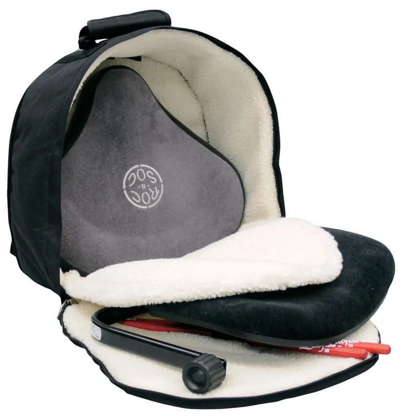 | 17" wide, 17" high and 8.5" deep, this case will take all saddle thrones such as the Roc n Soc |