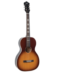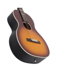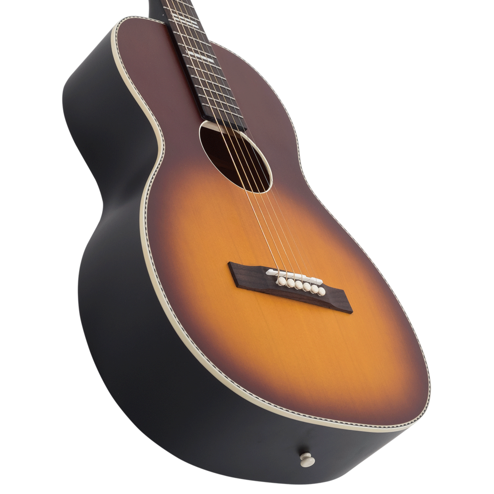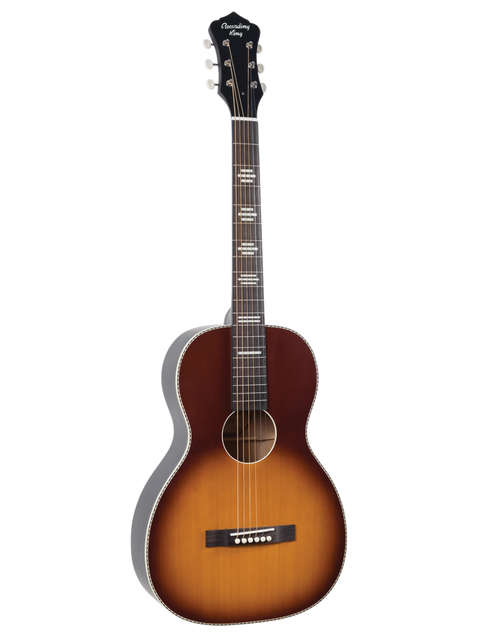 The Recording King Dirty 30s Series 7 Single 0 oozes vintage Recording King vibes, with its vintage-style parts, and its Tobacco Sunburst finish. It doesn't just look the part though, it sounds it too - with a thin C-profile Mahogany neck, Spruce top, Whitewood back and sides, an Ovangkol fretboard, and Sitka Spruce Cross Lap X Bracing, you can expect punchy vintage Single 0 tones. Some of the vintage appointments include a bone nut and saddle, bound soundhole, teardrop pickguard, ivory-button machineheads, and Harmonella stencil fretboard markers. When you are ready to go live, just plug in the Fishman Sonitone pickup system and you'll be heard with glorious vintage acoustic tone.