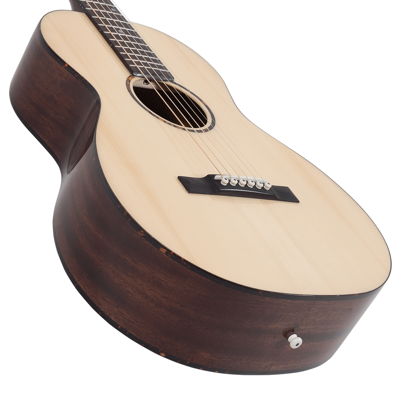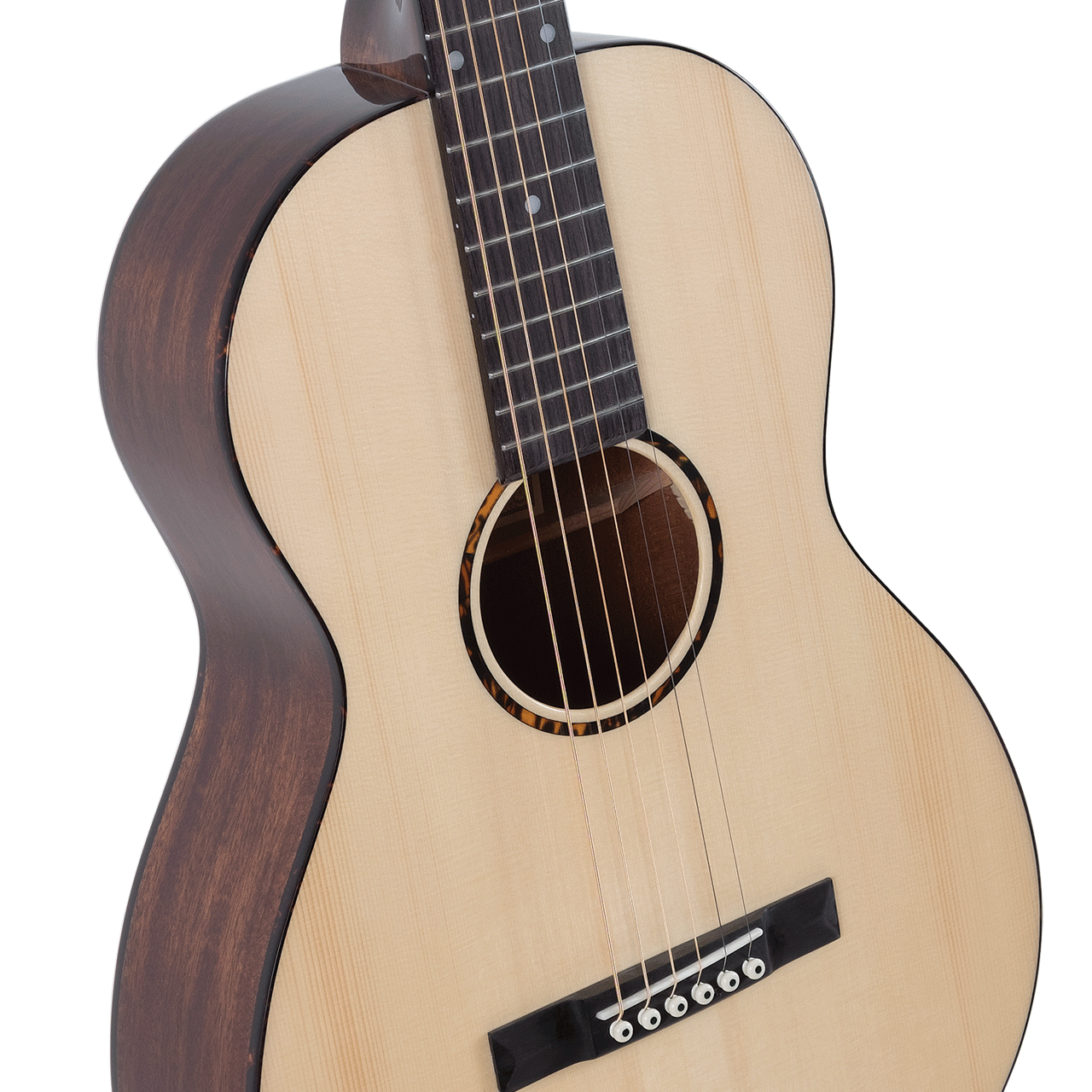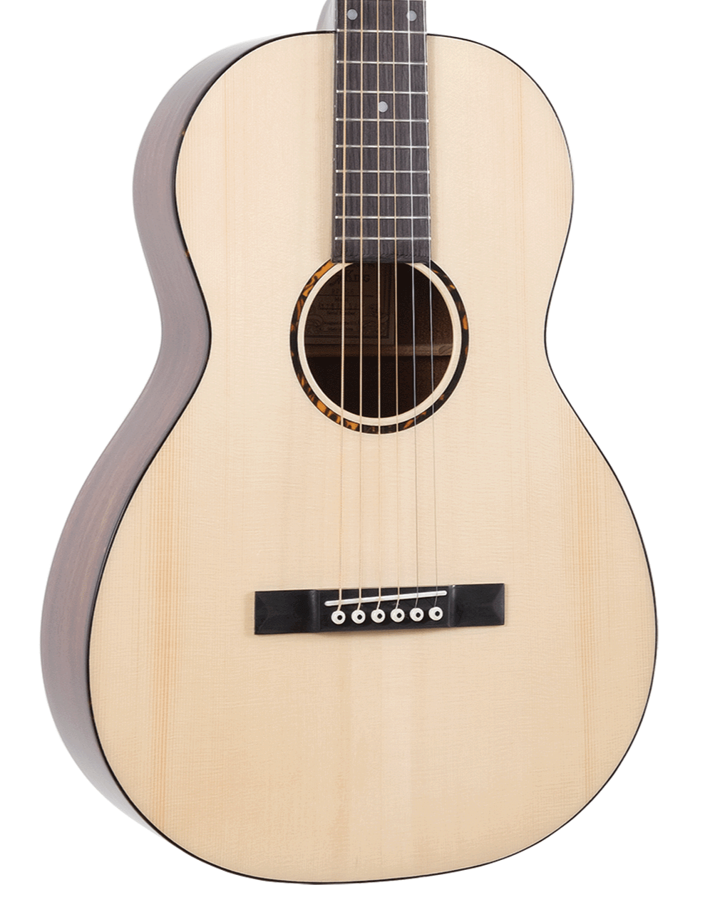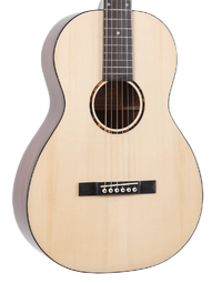 The Recording King G6 Size 0 Solid Top Acoustic Guitar wraps great tone and elegant appointments into a stunningly affordable package. With a solid spruce top and bone nut & saddle, these guitars deliver a sound that will please both bedroom pickers and professionals alike. The tortoise rosette elevates the aesthetic but keeps things understated for players who prefer to let the playing stand out.