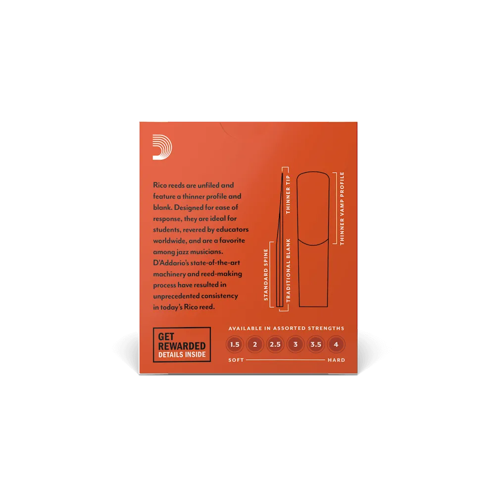 Rico by D'Addario Alto Saxophone reeds are crafted with beginners and educators in mind, thanks to their traditional blank and profile for ease of response, plus unfiled cut for added support. These reeds are available for a full range of clarinets and saxophones to best suit your playing needs.