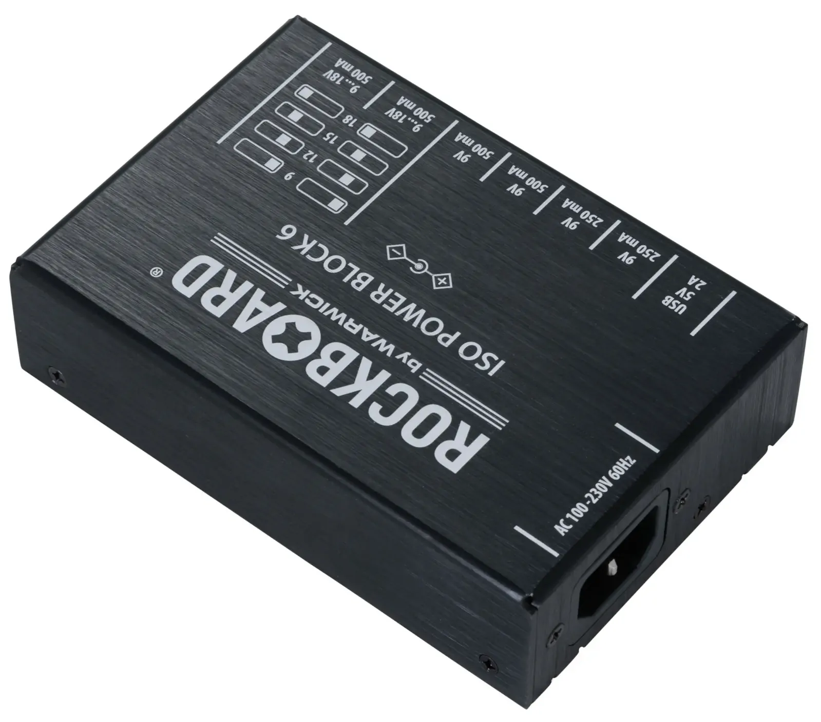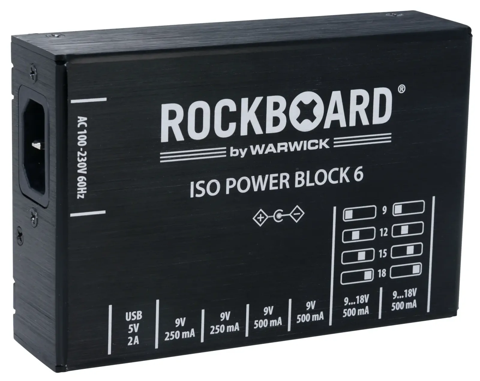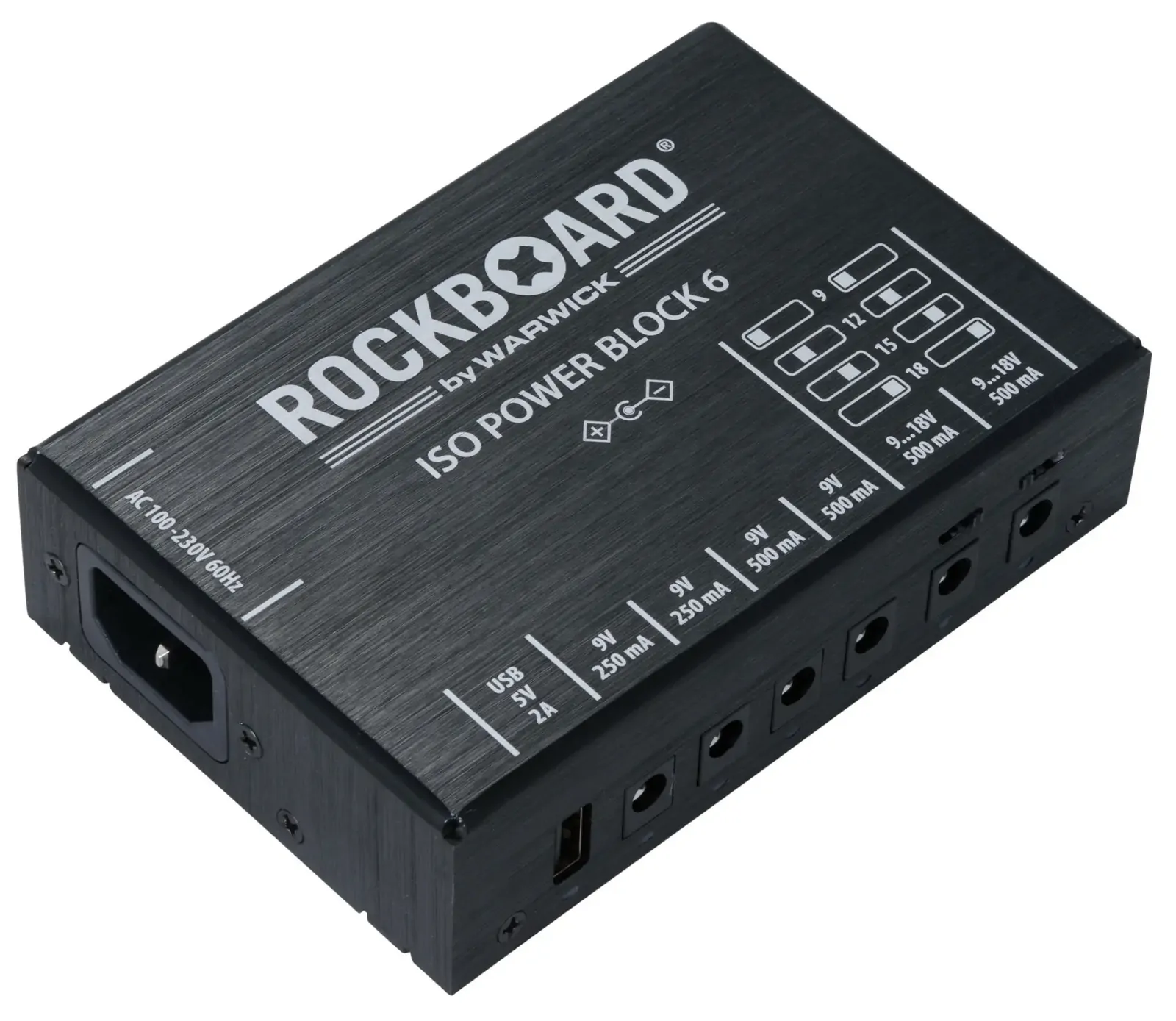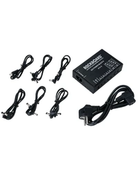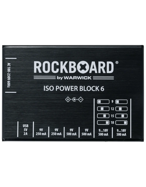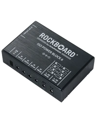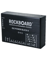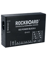 The RockBoard ISO Power Block V6 IEC is a compact, isolated multi-power supply designed for powering up to six effects pedals without noise. Featuring six highly filtered, transformer-isolated outputs and an additional USB port, it delivers clean, reliable power across different voltages. Two switchable outputs offer flexible options ranging from 9V to 18V, while short circuit protection ensures that any fault only affects the impacted slot, keeping the rest of your setup running. Advanced filtering eliminates high-frequency noise, making it ideal for both studio and stage. Housed in a robust aluminium chassis, it comes complete with flat power cables and an AC power cable for easy setup. At Riffs & Licks Music, we think this is a dependable, space-saving solution for players who need versatility and consistency in their pedalboard power.