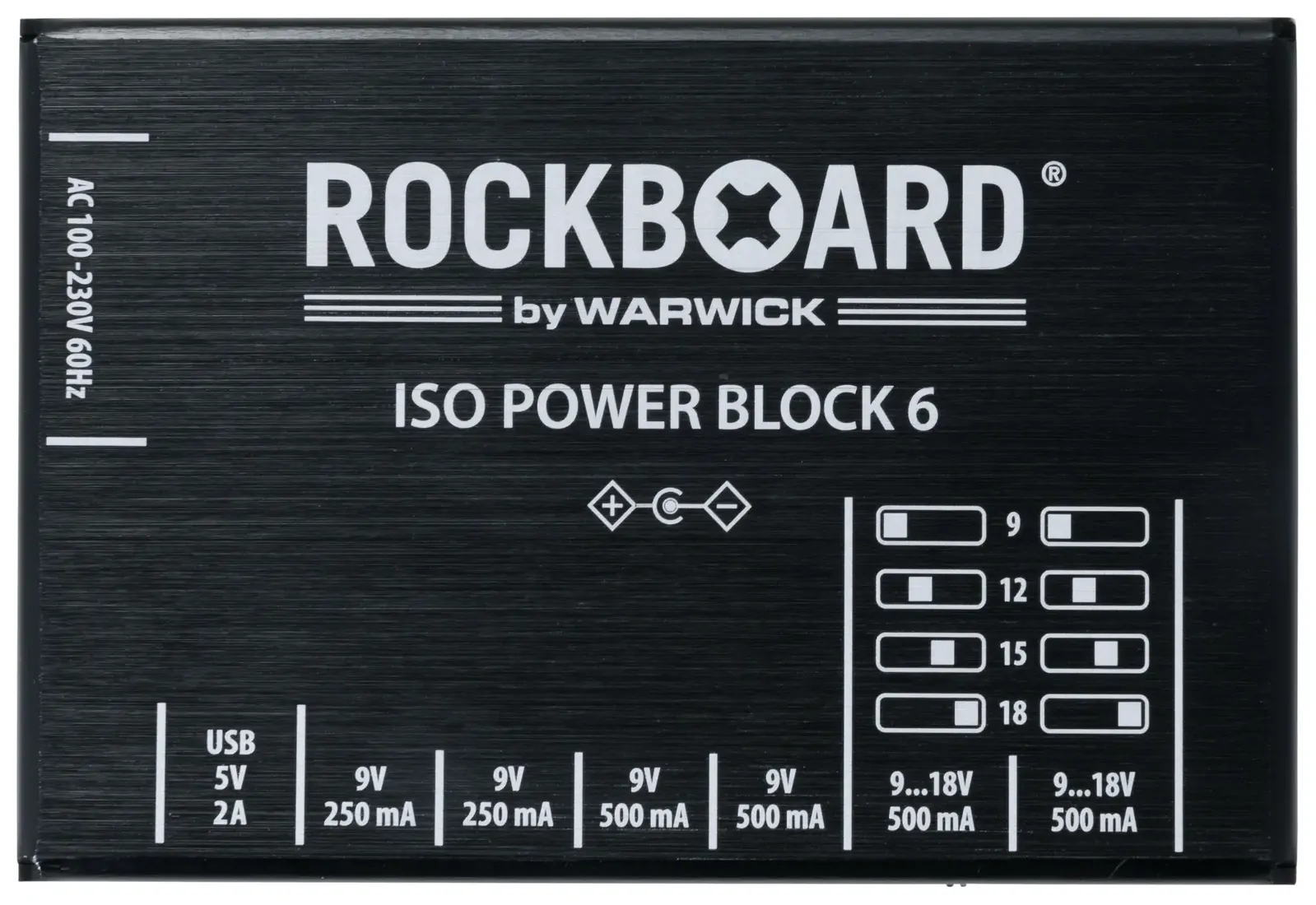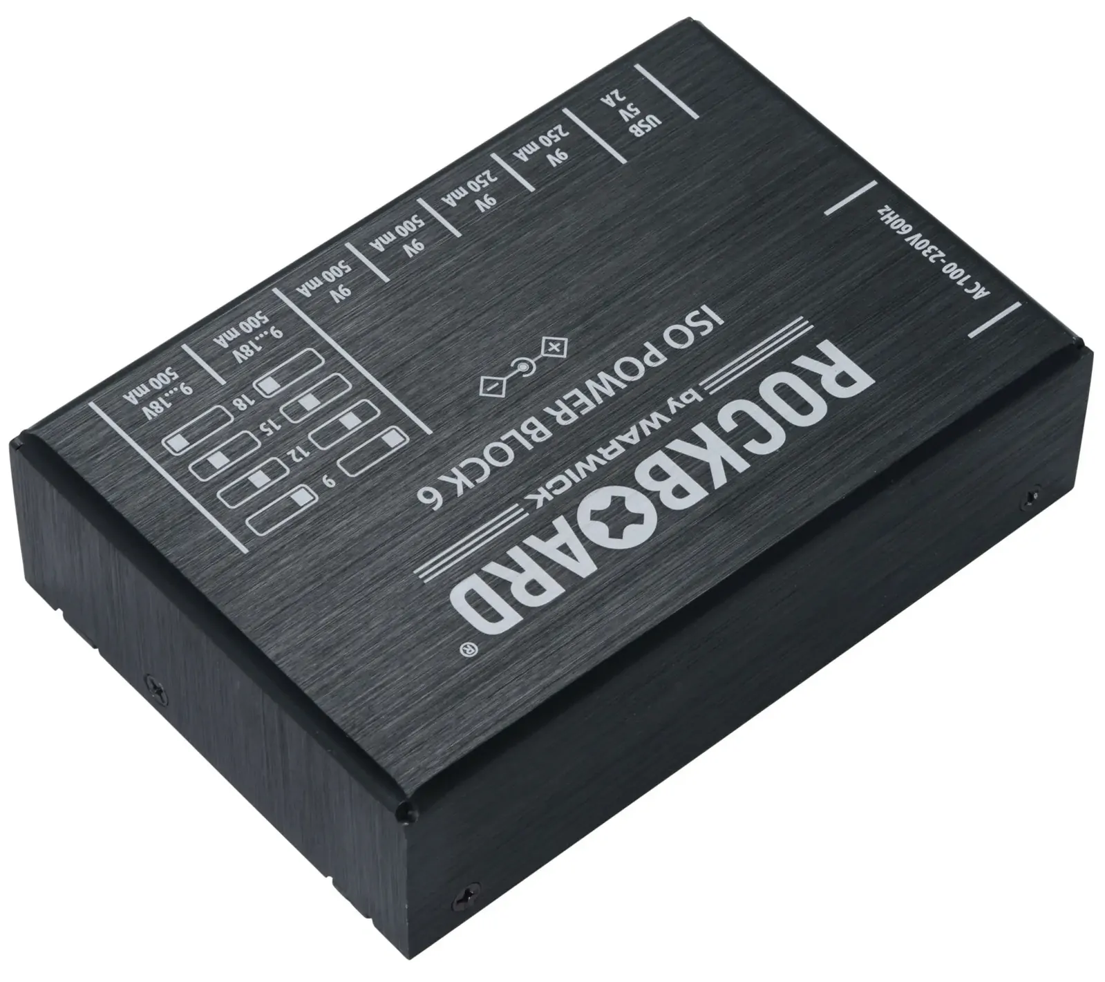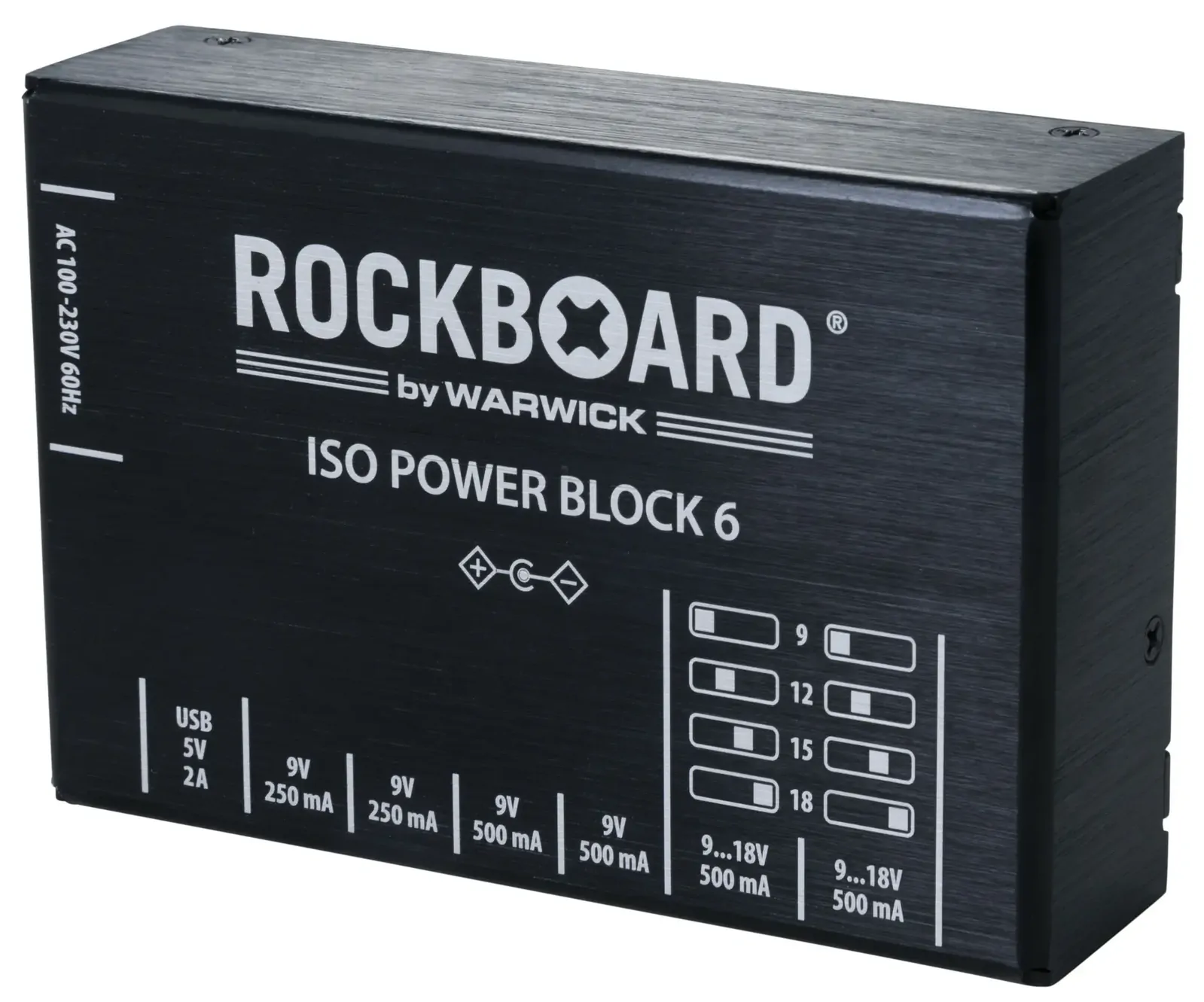The RockBoard ISO Power Block V6 IEC is a compact, isolated multi-power supply designed for powering up to six effects pedals without noise. Featuring six highly filtered, transformer-isolated outputs and an additional USB port, it delivers clean, reliable power across different voltages. Two switchable outputs offer flexible options ranging from 9V to 18V, while short circuit protection ensures that any fault only affects the impacted slot, keeping the rest of your setup running. Advanced filtering eliminates high-frequency noise, making it ideal for both studio and stage. Housed in a robust aluminium chassis, it comes complete with flat power cables and an AC power cable for easy setup. At Riffs & Licks Music, we think this is a dependable, space-saving solution for players who need versatility and consistency in their pedalboard power.