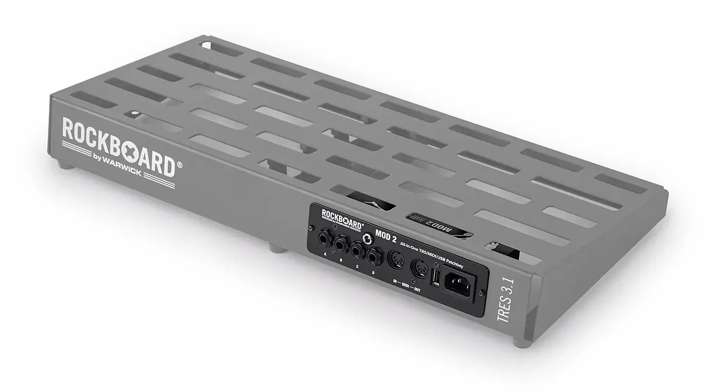 The RockBoard MOD 2 V2 is a multi-function patchbay designed for pedalboards that integrate MIDI, USB, stereo, and power connections. Featuring four TRS through-ports, dual MIDI throughs, USB Type A through, DC barrel, and AC IEC through connections, the MOD 2 V2 is perfect for managing complex setups including synths, stereo rigs, and USB-based interfaces. Its mirrored rear panel keeps all routing tidy and accessible. A MOD RACK (not included) allows mounting on a variety of pedalboards beyond the RockBoard range. Whether you're running a 4-cable guitar setup or controlling MIDI devices and computers, the MOD 2 V2 makes setup fast and seamless.