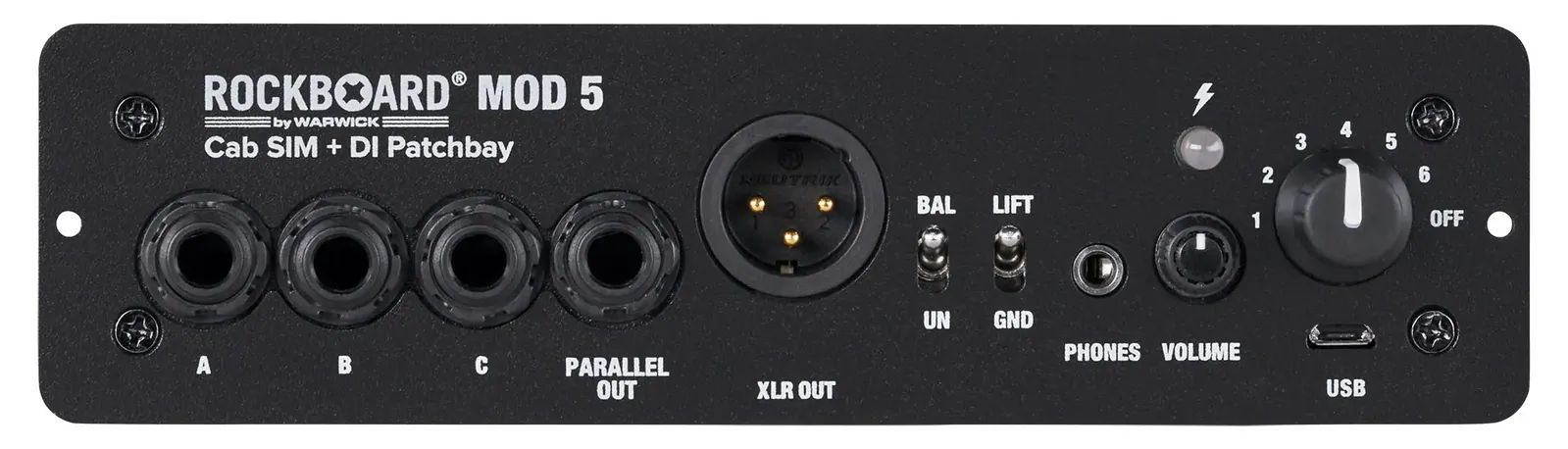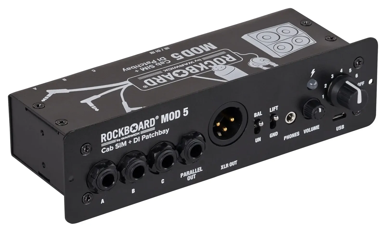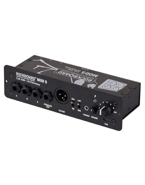 The RockBoard MOD 5 Cab SIM + DI Patchbay is a powerful all-in-one solution for pedalboard users needing cabinet simulation, DI, and efficient cable management. It features 6 built-in IR-based stereo cabinet sims and supports custom IRs for a personalised sound direct to FOH or recording setup. An onboard active DI and ground lift make it gig-ready, while a headphone amp with volume control allows for quiet practice. The MOD 5 also acts as a patchbay with 3 TRS through connections, XLR DI out, parallel outputs, and USB for firmware and IR updates. Compatible with RockBoard MOD slots (as well as other brands, via an optional MOD RACK), the MOD 5 brings flexibility, clarity, and order to any rig.
