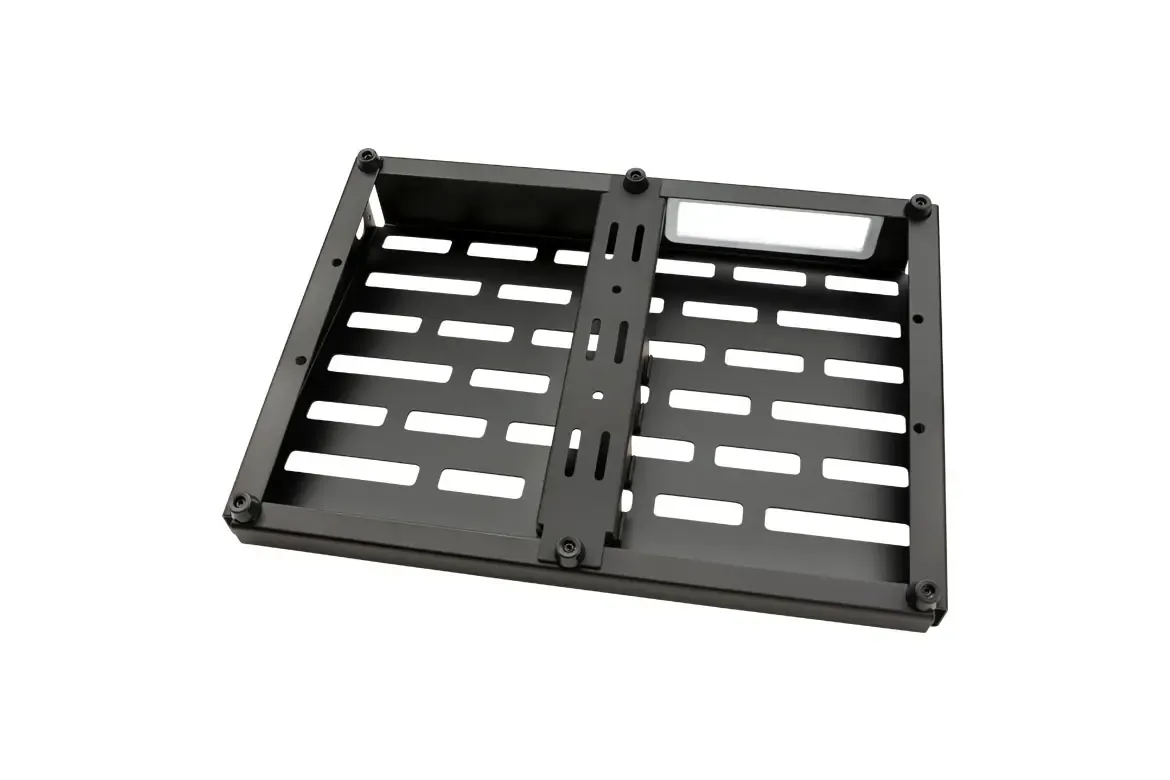 The RockBoard QUAD 4.1 Pedalboard with Flight Case is a durable and lightweight solution for serious players who need reliable transport and tidy cable management. Built from a single sheet of cold-rolled aluminium with no welds, it offers a rigid, flat surface supported by vertical struts for added stability. Its angled, slotted design allows for clean cable routing and easy pedal mounting, with compatibility for RockBoard’s QuickMount system and most common power supplies. This model supports 7 to 12 pedals and includes a MOD slot for use with RockBoard patchbays. A heavy-duty flight case ensures your setup stays protected on the road.