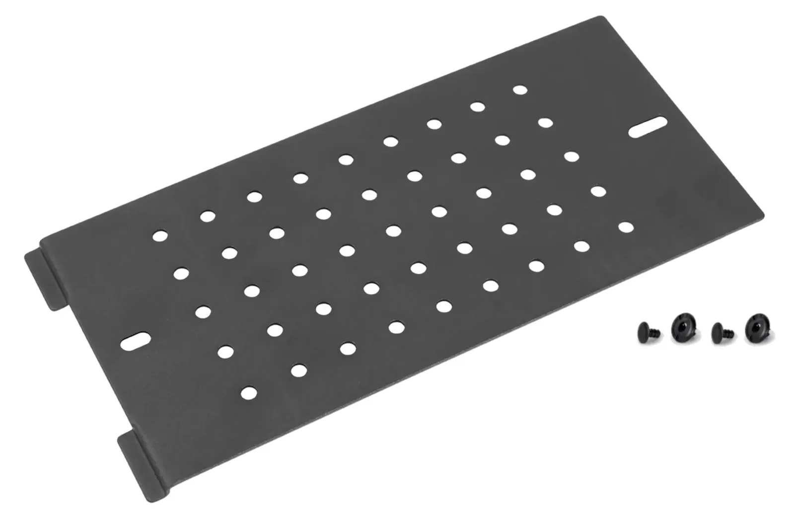 The RockBoard The Tray is a universal mounting solution for pedalboard power supplies, designed to fit under most new RockBoard models (excluding DUO 2.0–2.3 and TRES 3.0). Built from durable steel, The Tray offers a perforated surface that allows flexible mounting using screws, cable ties, hook-and-loop, or adhesive tape. It attaches easily using the board’s existing support brace structure—no drilling required—and is secured with just one screw. Whether you're running a compact or full-size power supply, The Tray ensures a clean, secure installation beneath your board for a clutter-free setup.