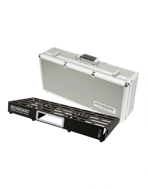 The RockBoard TRES 3.2 is a rugged, no-weld pedalboard crafted from a single sheet of cold-rolled aluminium. Its torsion-resistant surface and slotted design make routing cables and mounting pedals fast and tidy, while the QuickMount system eliminates the need for hook and loop tape. Designed to hold 7 to 12 pedals (depending on size), it features additional bracing for strength, a MOD slot for patchbays (patchbay not included), and mounting space for most power supplies underneath. This version comes with a robust flight case, ideal for keeping your gear secure during transport by road.