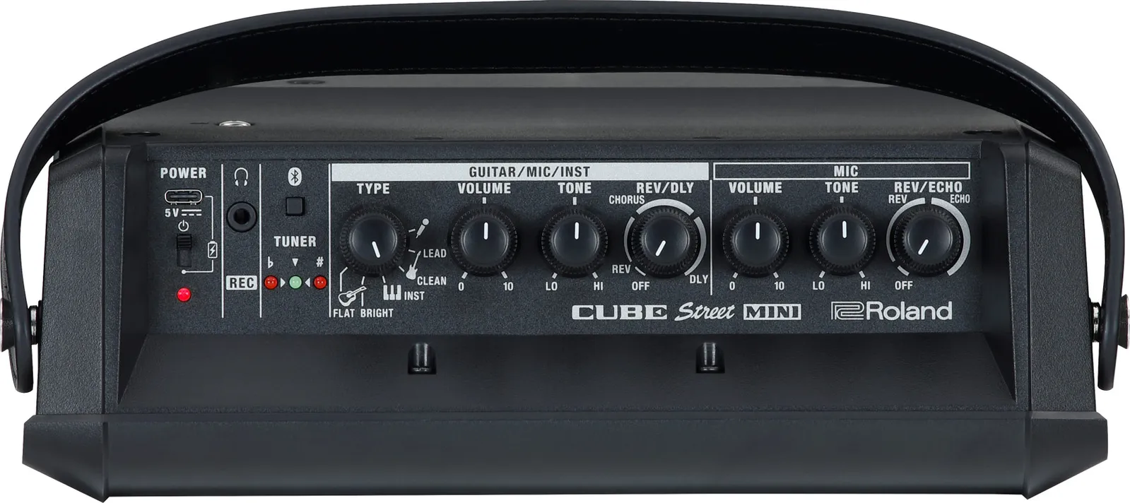| Guitar/Mic/Inst Controls | Type switch (Flat, Bright, Inst, Clean, Lead, Mic), Volume knob, Tone knob, Reverb/Delay knob |
