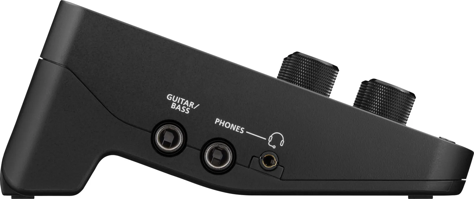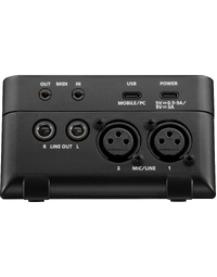 | Connectors | MIC/LINE (1, 2) jacks: XLR type (Phantom power DC 48 V, 10 mA Max); GUITAR/BASS jack: 1/4-inch phone type (supports high impedance); LINE IN (L, R) jacks: 1/4-inch phone type; AUX jack: Stereo miniature phone type (TRRS); PHONES jack: Stereo 1/4-inch phone type; PHONES (MINI) jack: Stereo miniature phone type (CTIA, PLUG-IN power); LINE OUT (L, R) jacks: 1/4-inch phone type; MIDI (IN, OUT) jacks: Stereo miniature phone type; USB port: USB Type-C (R) (USB Audio Class 2.0/1.0, MIDI); POWER port: USB Type-C (R) |