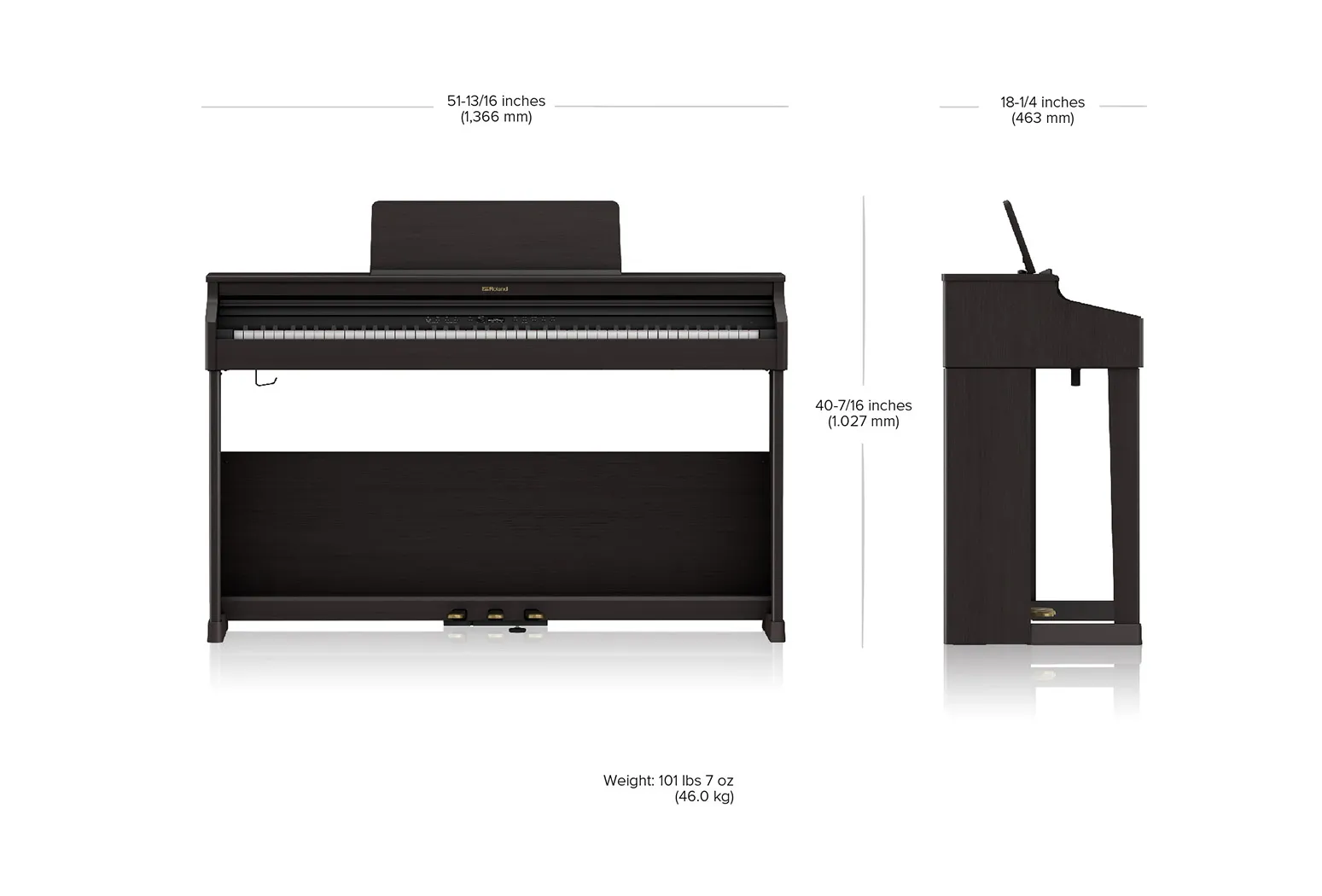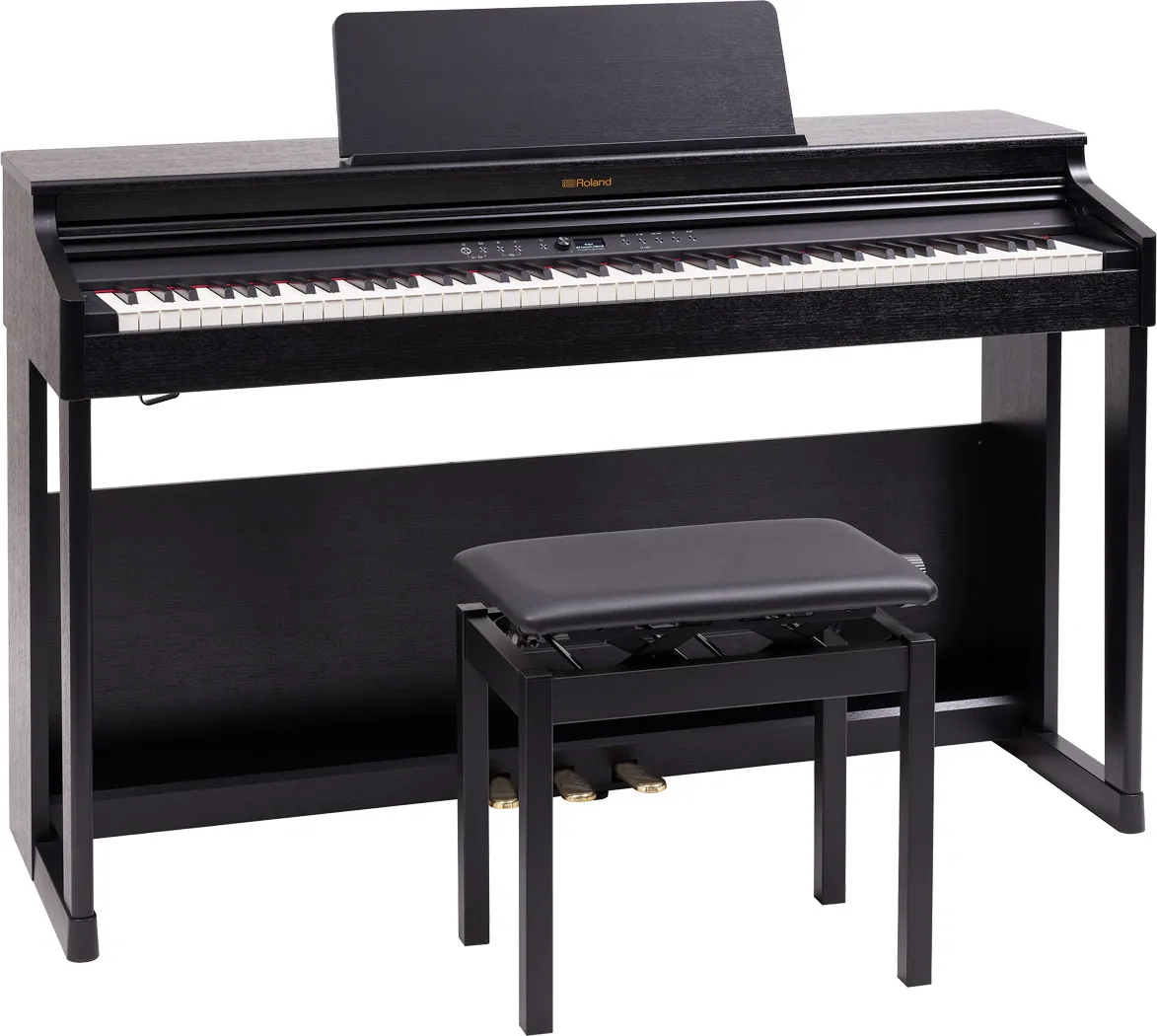 The Roland RP701 is the perfect digital piano for the whole family, offering an authentic playing experience with rich, expressive sound and a realistic feel. Powered by Roland’s SuperNATURAL Piano technology, it delivers dynamic tones, while the PHA-4 Standard keyboard with escapement and ivory-touch keys ensures a natural touch. The Progressive Damper Action pedal allows for advanced expressive techniques. Designed for ease of use, the RP701 features an intuitive interface with simple controls and hidden icons, keeping the focus on playing. Bluetooth connectivity enables wireless music streaming and compatibility with educational apps, making learning more engaging. Headphones 3D Ambience provides an immersive private playing experience, and built-in speakers fill the room with full, resonant sound. With a sleek, elegant design inspired by Roland’s high-end pianos, the RP701 fits beautifully into any home. It includes a height-adjustable BNC-05 bench, making it ready to play straight out of the box.