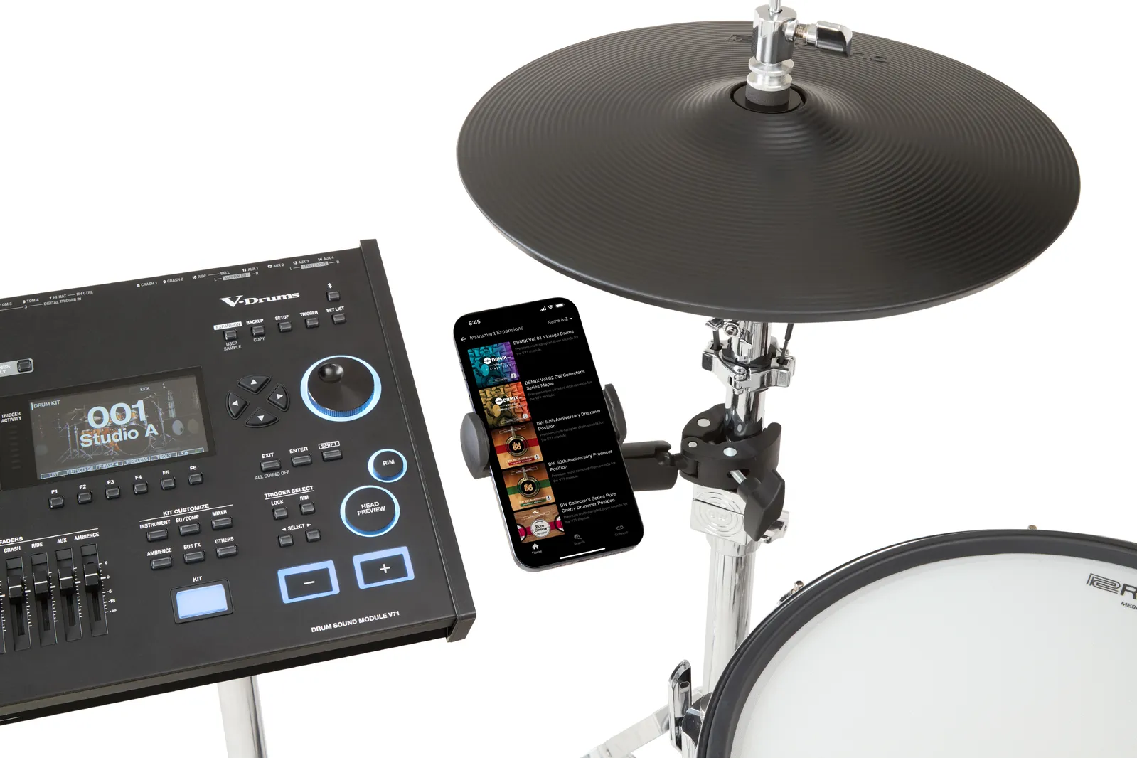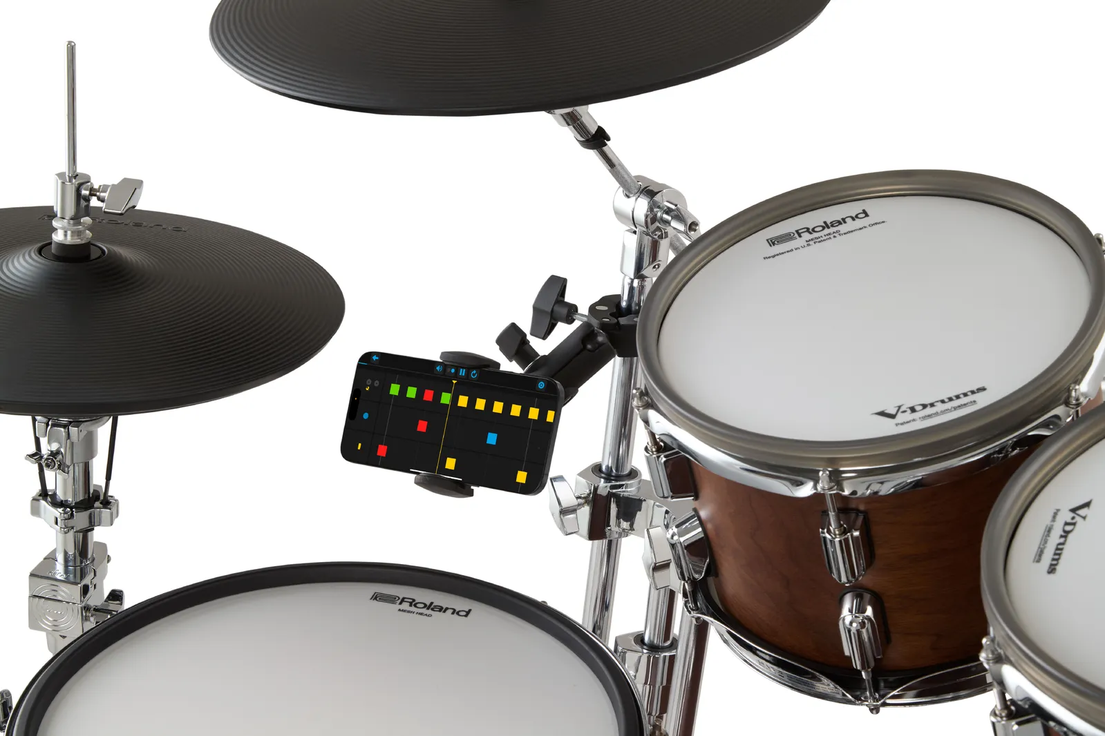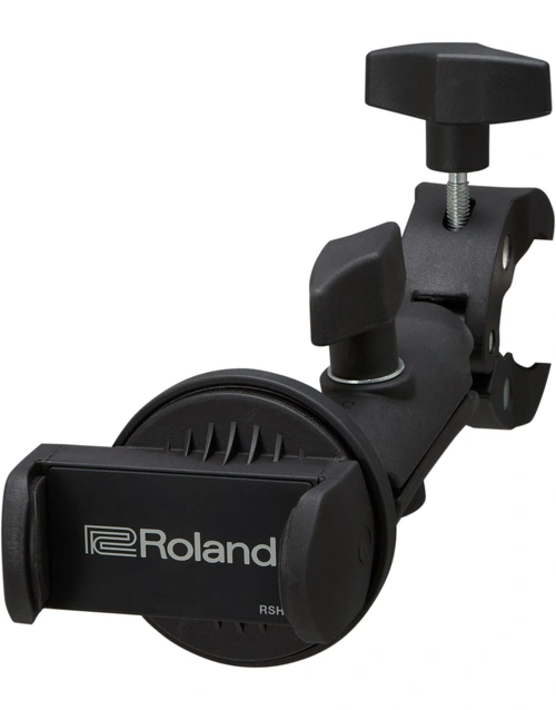 The Roland RSH-10 securely mounts your smartphone within your V-Drums setup, keeping your device easily accessible during practice or performance. Featuring a spring-loaded clamp with cushioned grips and a strong magnetic holder, it provides one-handed adjustment for portrait or landscape viewing. Dual ball joints offer flexible positioning, while the heavy-duty clamp attaches to various stand diameters. Perfect for using the V-Drums Play app, streaming music, or following lessons, the RSH-10 keeps your smartphone steady and in reach while you play.
