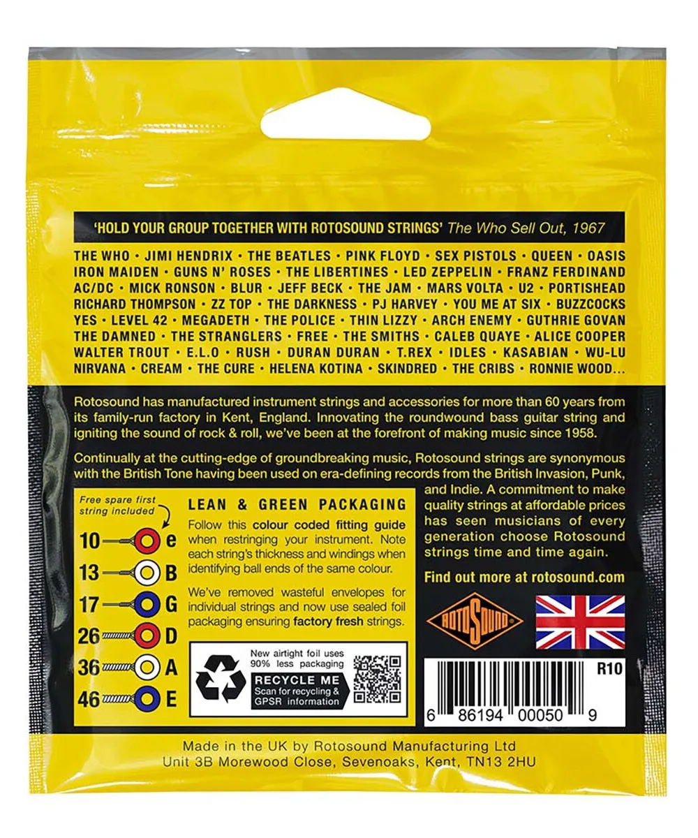 Rotos are Rotosound's best-selling electric guitar strings. The combination of silky nickel wrap and powerful steel core make Rotos a great all-rounder for any playing style or genre. Manufactured in the UK to precise tolerances and using only the finest materials, you can rely on Rotos for consistent tone and performance in every packet. Always offering value alongside quality, all of Roto sets come with an extra 1st string to keep your set going even longer!
