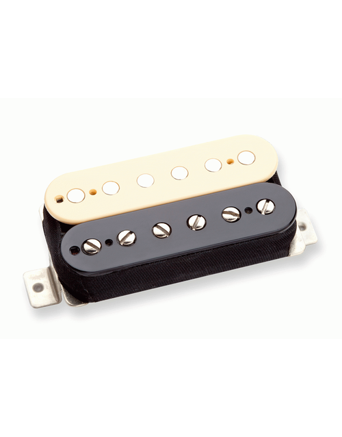 The ’59 bridge model is a vintage output humbucker that’s great for rock, blues, and more. Its vintage-inspired coils give it an airy quality that is firmly in the P.A.F. family, and the alnico 5 bar magnet and vacuum wax potting make it compatible with lighter guitar strings and louder amplifiers than were ever used in the 1950s. The result is a pickup with tons of old-school tonal character, but with a brighter top end, and a slightly more compressed sound. The ’59 neck model is one of our most popular pickups because it’s so versatile. Like its bridge-position sibling, the ’59 neck is designed in the spirit of the original P.A.F. humbuckers of the 1950s, with sweet sustain, and a warm, full sound that still possesses a clear attack. We’ve made a few refinements to slightly modernize the design and make it more adaptable to different styles. The high end is slightly boosted for improved pick-attack clarity and the mids are a little scooped for an open, smooth sound that’s great for preserving the clarity of the individual notes in a chord. The ’59 neck was born to accompany the ’59 bridge, but countless players pair it with a high output bridge humbucker, such as a JB or Custom. It’s also a popular choice for humbucker-routed Telecasters. Offered in 6-string standard humbucker and Trembucker spacings, the ’59 model features a variety of traditional vintage treatments, such as 42AWG plain enamel mag wire, long-legged nickel-silver bottom plate, vintage single-conductor braided push back lead wire, and no logo. If you opt for a four-conductor version for coil splitting, the ’59’s single coil mode is crystal clear. As with all of our P.A.F.-style pickups, the ’59 vintage output humbucker is wound on Seymour’s classic Leesona 102 pickup winding machine from the old Gibson factory in Kalamazoo, MI. Also available for neck and bridge in a passive mount 7-string configuration.