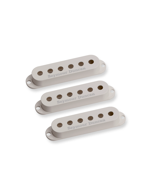 Seymour Duncan's Strat pickup covers are designed to have exactly the same physical dimensions as a Fender American Standard Strat pickup cover. They will fit all of Seymour Duncan's SSL-model single coils (with the exception of the Quarter Pound models, which are too large for a cover). This is a set of three covers, with or without the Seymour Duncan logo printed in silver. The black glossy finish is designed to match the colour of Fender’s black covers. The cream coloured glossy finish is designed to look like an old ‘aged white’ cover. The off-white parchment coloured glossy finish is designed to match Fender’s standard white colour.