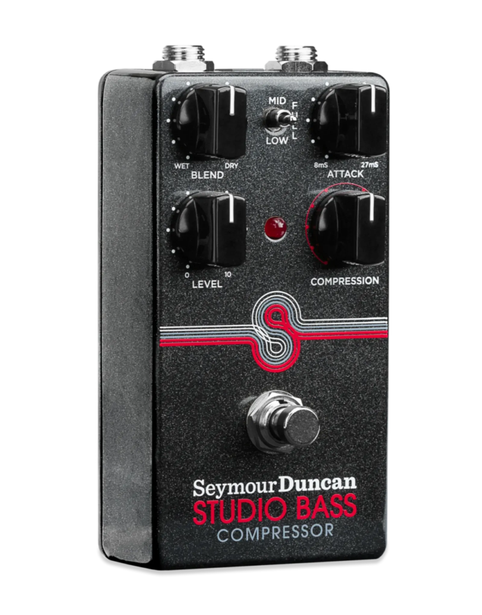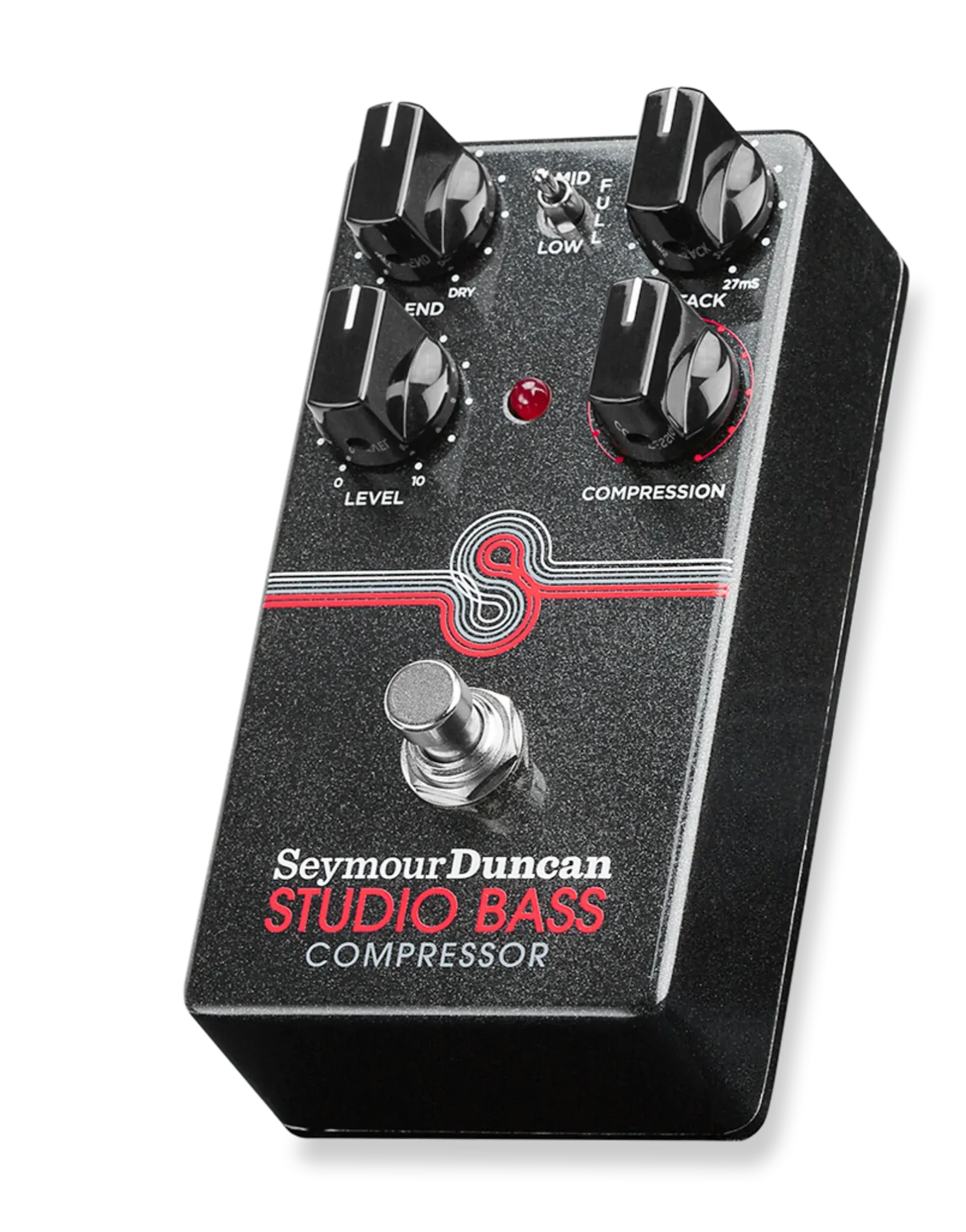 The three-position toggle lets you choose how the compression responds across Full, Mid, or Low frequencies. Focusing on the mids helps your notes cut through dense mixes, while the low setting adds weight and depth without getting muddy. The blend control is where this pedal really opens up, letting you bring your clean signal back in so your attack and articulation stay clear, rather than being fully compressed.