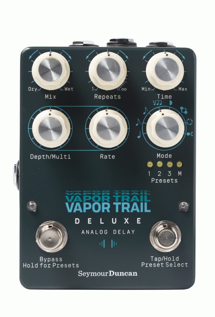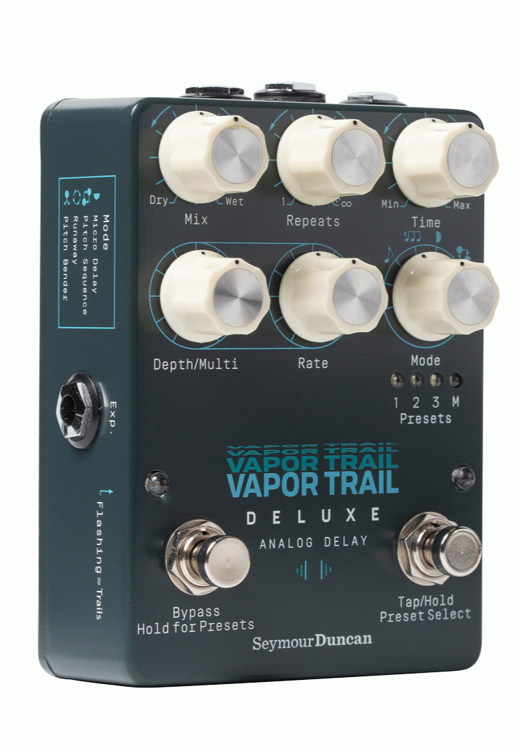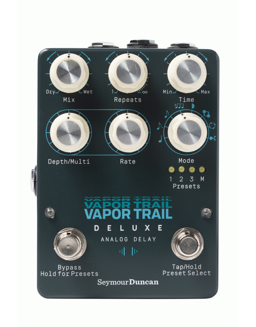 The Seymour Duncan Vapor Trail Deluxe Analog Delay Pedal builds on the legacy of the original Vapor Trail analog delay pedal. Its warm, Bucket Brigade repeats, and 3-dimensional modulation continue to inspire guitarists around the world. But its expanded control, new sonic modes, and storable preset locations make the Vapor Trail Deluxe analog delay one of a kind.
