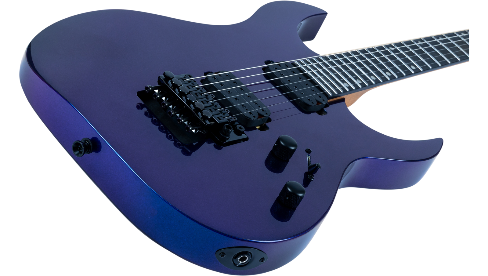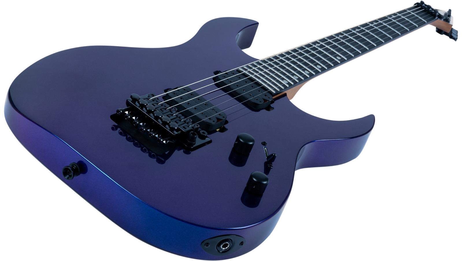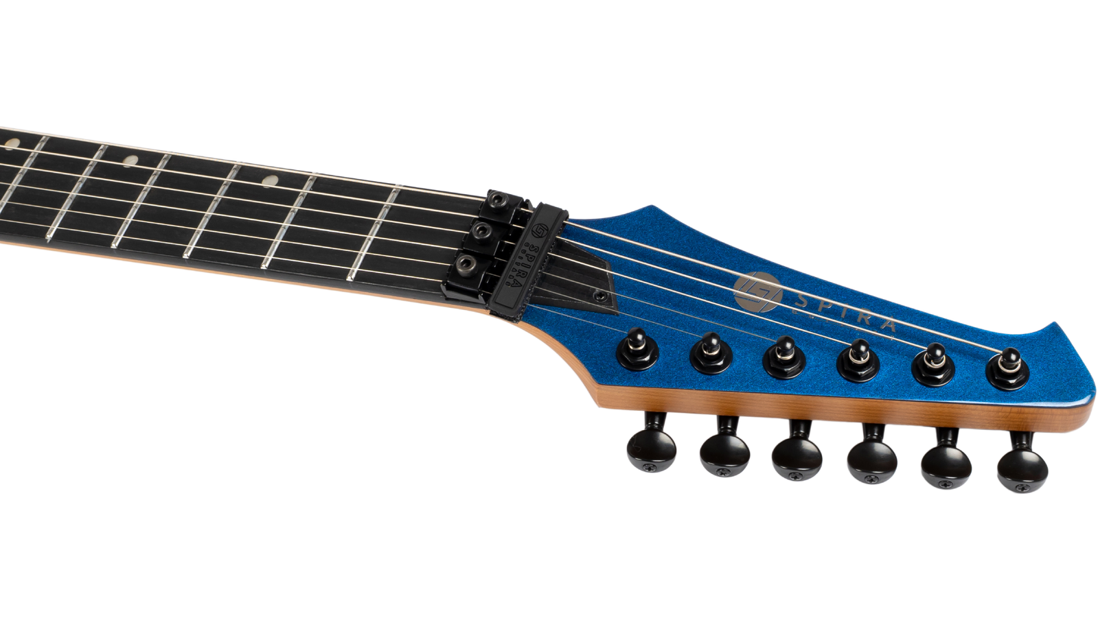 The Spira Guitars S-420 is a modern double-cutaway electric built for high-performance rock and metal. Its roasted poplar body is paired with a satin Canadian roasted maple neck and Ebony Tech fretboard for fast, stable playability. The 24 jumbo frets and 14″ radius make for smooth bends and effortless shredding, while the locking tremolo bridge offers tuning stability under aggressive vibrato techniques. Spira’s custom Villain humbuckers with 12k ceramic output deliver high-gain clarity and punch, perfect for heavy riffs and soaring leads. Finished in gloss Chameleon with sleek black hardware, the S-420 balances style with serious performance.